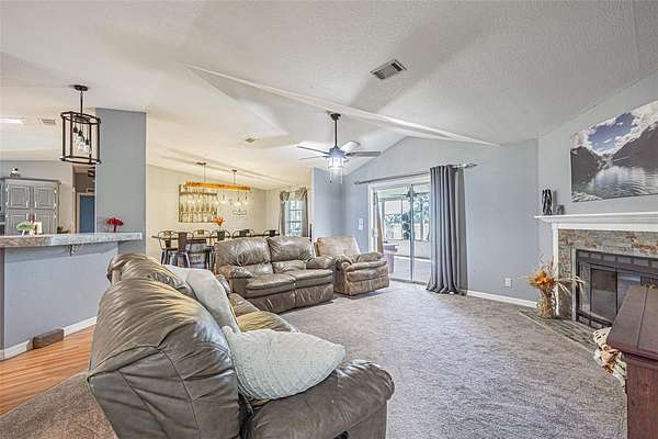 Metal roof over both the home and lanai added 2010Huge 16' x 63' rear porch added in 1998--concrete slab with windows for year-round enjoyment and an insulated roofCozy great room with wood-burning fireplace Oversized kitchen with dark gray cabinetry, stainless steel appliances, a large prep island, and open views to the family and dining rooms **Split-bedroom floor plan for privacy: