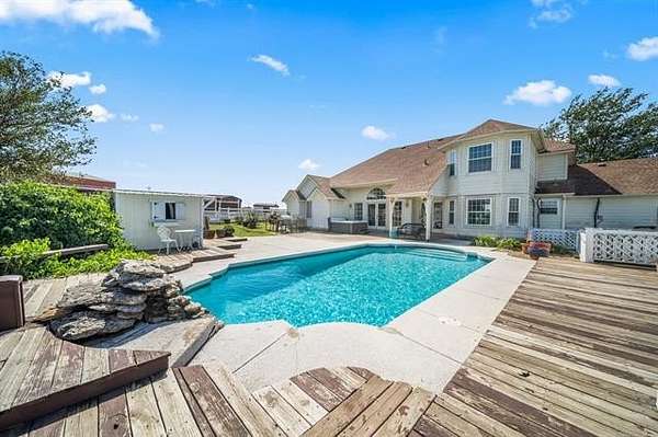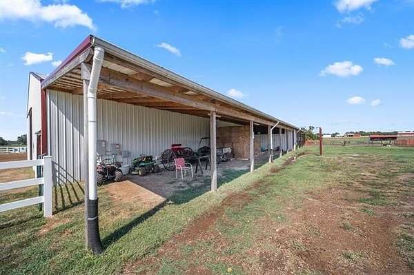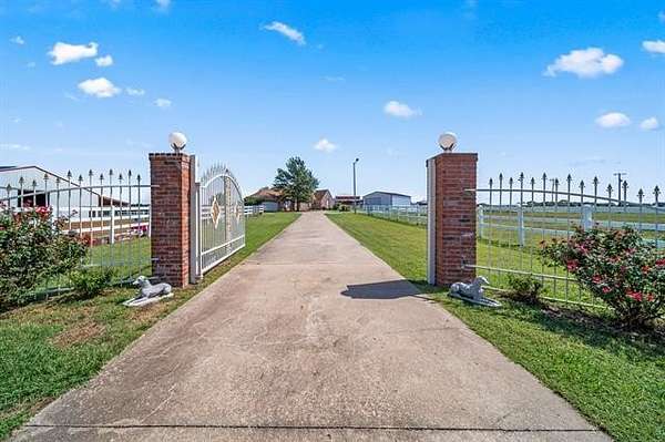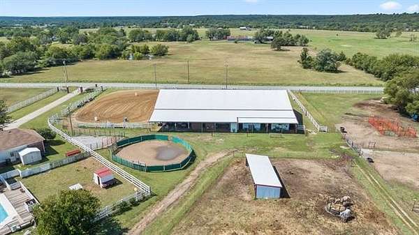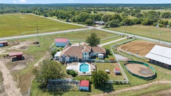There is an in-ground gunite pool with fountain and hot tub in fenced backyard. The land is fenced and cross-fenced into 12 separate pastures. Each pasture is equipped with its own run-in horse shelter. This is a corner lot with two separate gated entries, one is electrically gated for main house, and one manually gated entrance to the red barn.