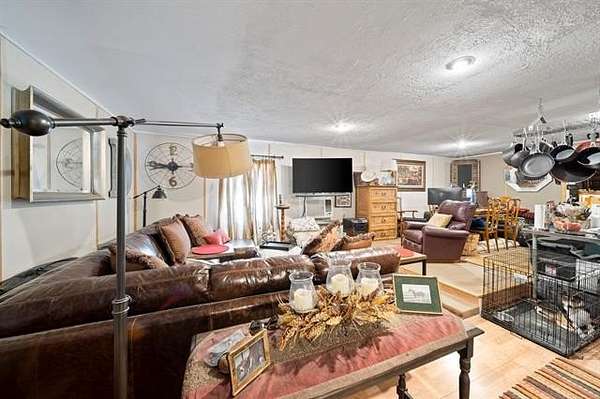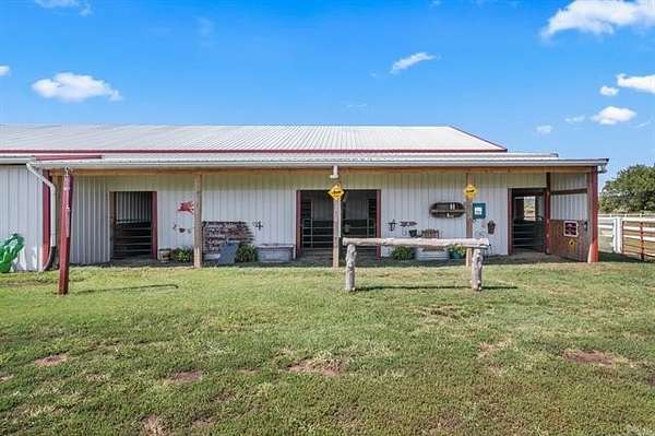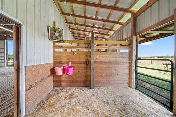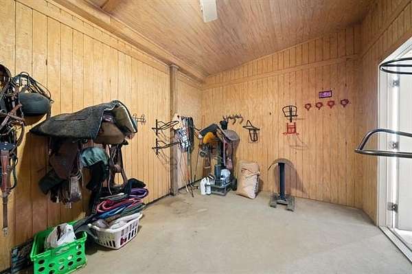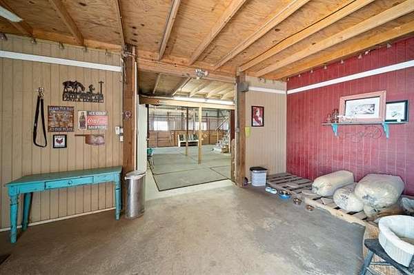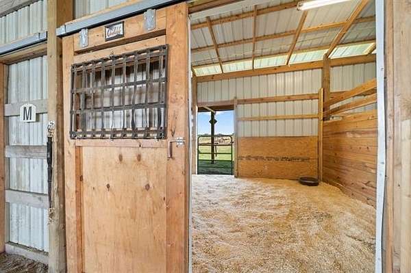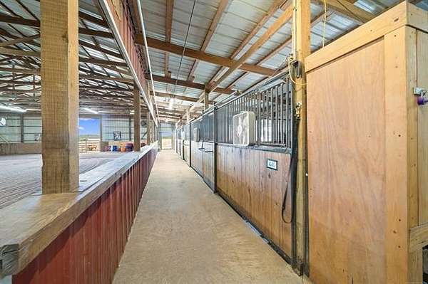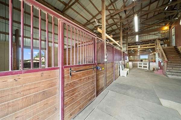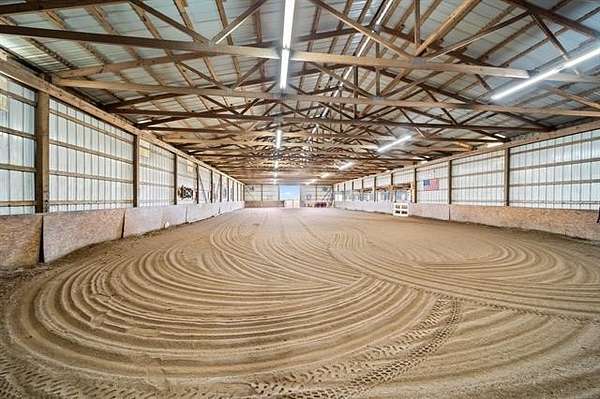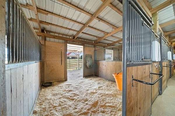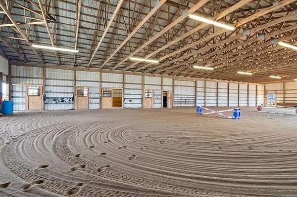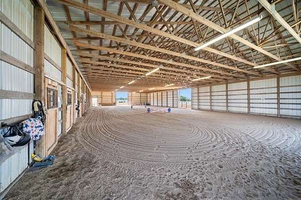 This property features two large barns, each with their own indoor, fully enclosed lighted riding arenas and attached stalls, tack rooms, feed rooms, and fun equine accessories. There is also a pond with a scattering of trees on the perimeter.