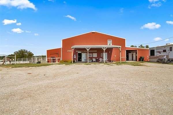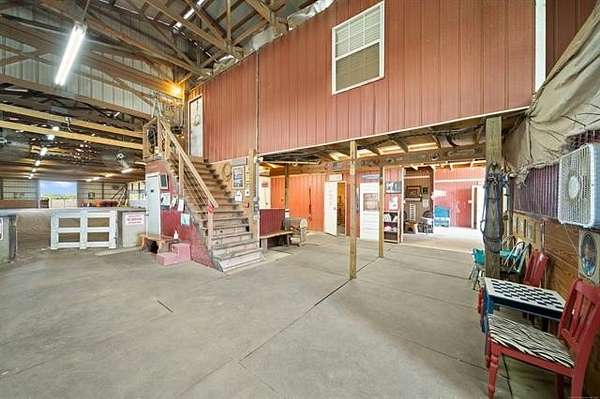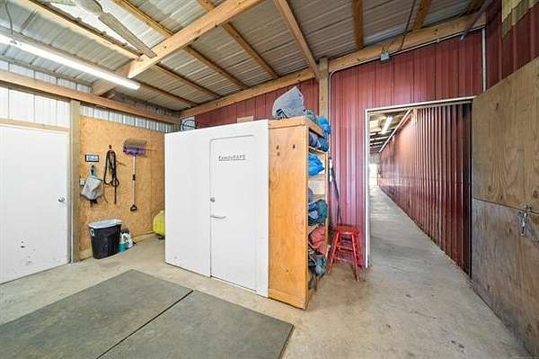 The red barn's arena is 110' by 50' and has 13 attached stalls. There are 3 tack rooms and one feed room. An above ground 8 person storm shelter is inside the red barn with half bath as well.