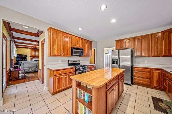 Located in the highly desirable Kimpton Woods in Troy Twp, this meticulously maintained and move in ready colonial is part of the Berkshire School District. Enter the open foyer and take in the curved staircase and loft with natural light. The living room is on the right and dining room on the left with beautiful wainscotting and detailed crown molding and 9 1/2 foot ceilings. Continuing in you enter the great room with coffered cherry ceiling, wet bar, and gas fireplace. The kitchen features stainless appliances and butcher block top island, and pantry. The eating area has a bay window view to the expansive back deck and yard. A half bath completes the main level. Between the kitchen and garage, a second back stairwell leads to the upper level. Upstairs you will find the master bedroom with walk-in closets and ensuite bath situated on the right side of the home for privacy. On the left of the loft, there are three additional bedrooms, each with ample closets and additional storage, and a full bath. You will also appreciate the 2nd floor laundry complete with extra capacity washer and dryer. The basement is carpeted and has a dry bar and is ready to finish to your own style. Outside you will love entertaining with family and friends on the large deck and enjoying quiet time in the gazebo. The three car garage is heated with water and has a workbench and storage cabinets. A shed is located off the back of the drive to store toys and equipment. Just minutes from Chagrin Falls and only 40 minutes to downtown Cleveland or the airport. Schedule your showing today and make this beautiful home yours.