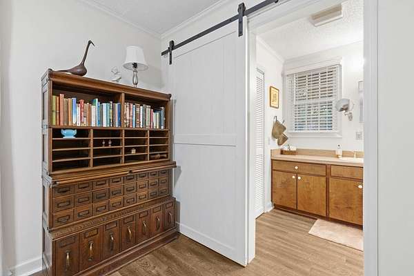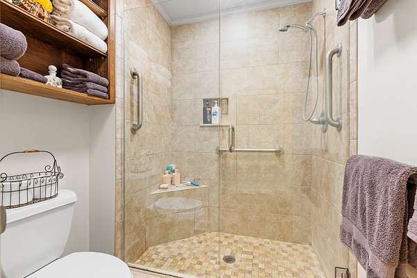- Blinds, Built-Ins, Fireplace, Luxury Shower, Main Level Master Suite, Master Bath, Moulding, Paneling, Sheetrock
