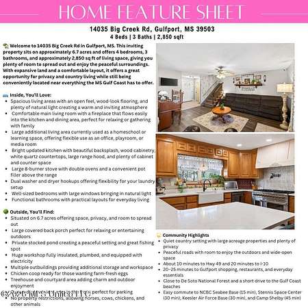 Some homes offer space. Others offer possibility. This one offers both in a way that feels rare and deeply personal. Situated on approximately 6.7 fully fenced acres within the highly sought after Lyman School District, this distinctive 4 bedroom, 3 bathroom residence offers nearly 2,850 square feet of thoughtfully designed living space featuring a desirable California split floor plan that creates both separation and connection throughout the home. Inside, the layout unfolds beautifully with both a welcoming sitting room and a comfortable family room, allowing for multiple gathering spaces that support everyday living, entertaining, quiet relaxation, or hosting larger occasions with ease. Natural light moves effortlessly through these spaces, enhancing the warm and inviting atmosphere. At the heart of the home, the beautifully updated kitchen delivers true culinary presence, showcasing quartz countertops, a gourmet 8 burner stove, a stunning custom range hood, and a convenient pot filler, creating a space that feels equally suited for daily routines and memorable gatherings. The spacious primary suite offers a peaceful retreat with dual his and hers sinks, generous proportions, and an oversized walk in closet designed to accommodate modern lifestyles comfortably. An additional bedroom features its own private ensuite bathroom, ideal for guests, extended family, or added privacy. Step outside and the lifestyle expands dramatically. The fully fenced acreage, with additional fencing already in place for cattle or horses, provides exceptional usability and freedom. A stocked fishing pond invites slow mornings and relaxed afternoons, while a charming treehouse adds imagination and character to the property. The impressive fully insulated workshop, equipped with electrical service and plumbing, offers outstanding flexibility for hobbies, storage, or recreational equipment. Multiple outbuildings further enhance the property's versatility. The expansive covered back porch becomes a natural extension of the home, perfect for quiet evenings, open air dining, and enjoying uninterrupted views of the surrounding landscape. With no property restrictions, the land invites you to shape the lifestyle you envision. Despite its peaceful country setting, the home remains conveniently positioned near Highway 49 with access to Gulfport amenities and major regional employers including NCBC Seabee Base, Stennis Space Center, Keesler Air Force Base, and Camp Shelby, creating a rare balance between privacy and connectivity. For buyers seeking land, flexibility, and a lifestyle that cannot be recreated in traditional neighborhoods, this Gulfport property presents an exceptional opportunity. Note: Open House March 21st starting at 1:30 pm to 3:30pm