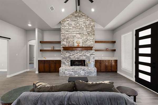 Step inside to soaring ceilings and abundant natural light pouring through large windows. The open-concept living area flows around a cozy gas-log fireplace and into a gourmet kitchen dressed in rich knotty alder stained cabinetry, gleaming quartz countertops, and included black stainless-steel appliances. A massive hidden walk-in pantry keeps everything beautifully organized.