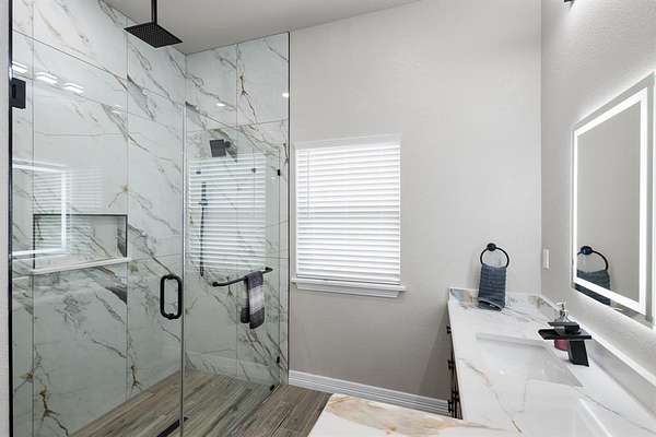 The luxurious primary suite boasts a huge walk-in closet and spa-like bath with custom tile shower and quartz vanity. Two additional bedrooms, a stylish guest bath with matching custom tile work, and a dedicated home office provide plenty of space for family, guests, or remote work.