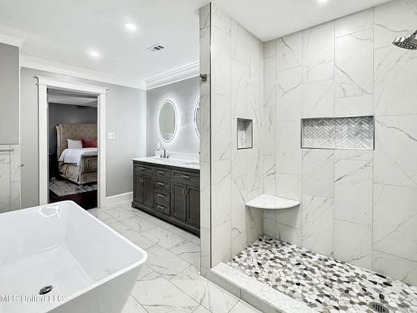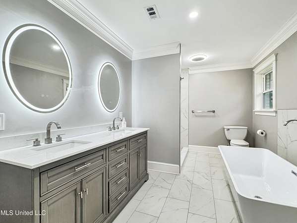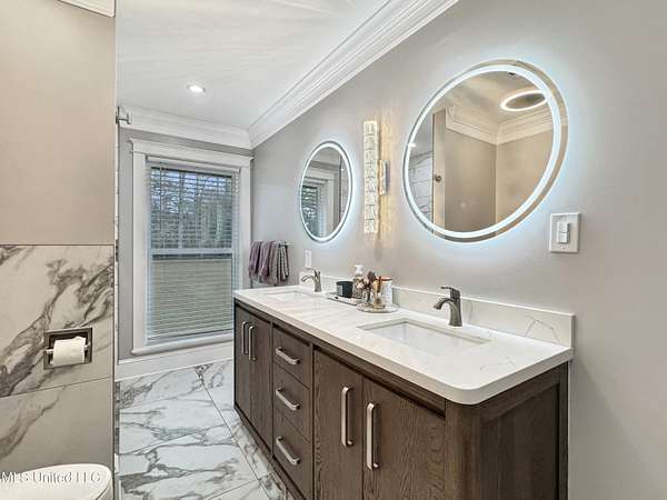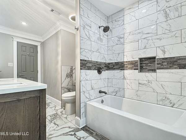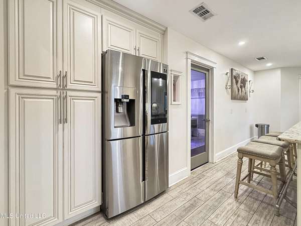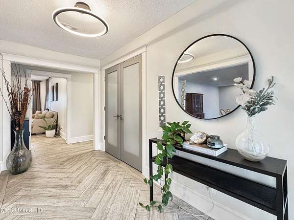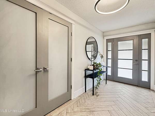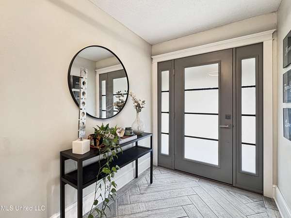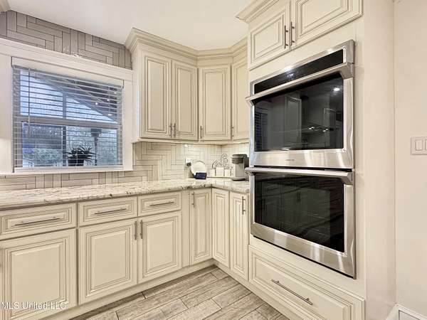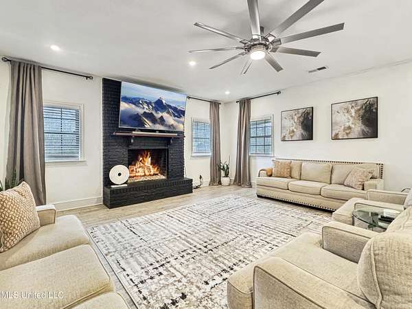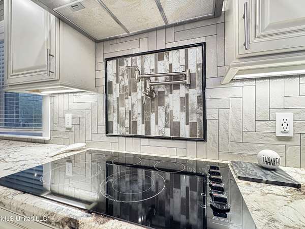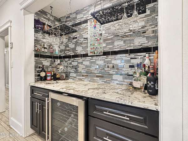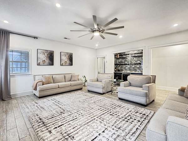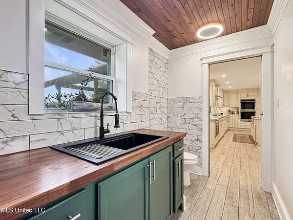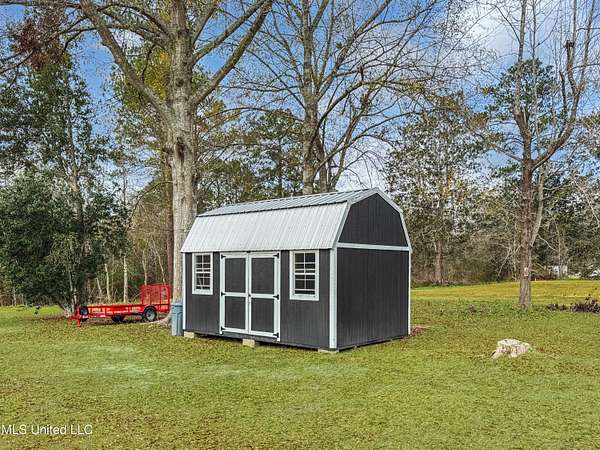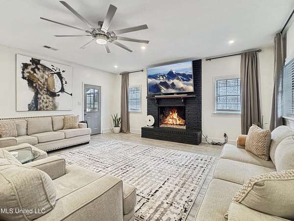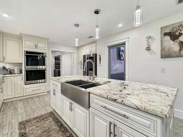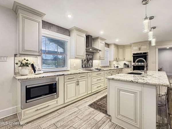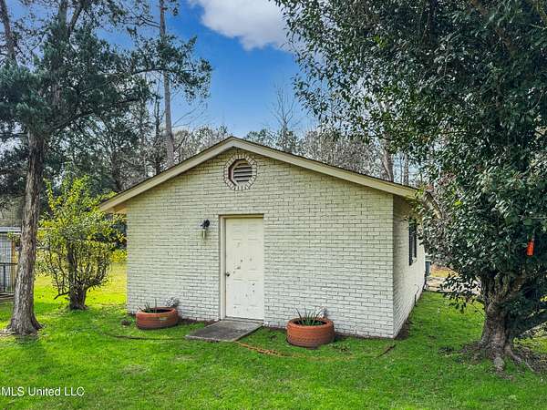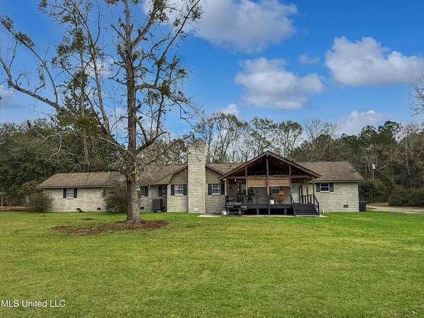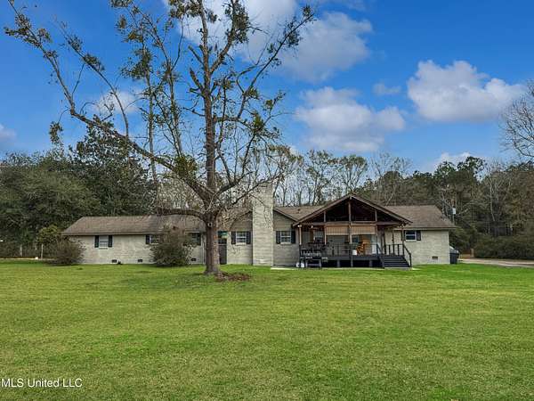 Welcome home to modern luxury on over 2.5 acres in Picayune! This stunning, completely remodeled 3-bedroom, 2.5-bath home is packed with high-end finishes and thoughtful design throughout. Step inside through the upgraded modern front door to a bright, inviting entry featuring a gorgeous statement light fixture and wood-look ceramic tile laid in a herringbone pattern. A versatile flex space offers endless options for a playroom, workout area, or additional living space. The spacious family room is anchored by a dark wood-burning fireplace, oversized ceiling fan, and a show-stopping custom wet bar with 3cm granite, custom tile, and wine fridge-perfect for entertaining. The custom kitchen is a dream with ivory-glazed cabinetry, 3cm granite countertops, custom tile backsplash, oversized island with stainless farmhouse sink, built-in stainless microwave, double ovens, 5-burner cooktop, and a pot filler with custom tile detail. The formal dining room is currently used as an office and features glass doors leading to the flex space. The shared full bath offers a dual vanity with quartz countertops, lighted mirrors, and a deep soaking tub/shower with custom tile to the ceiling. The primary suite is truly impressive with a private entry area, two custom walk-in closets, and a spa-like ensuite featuring a freestanding soaking tub, massive tiled shower, and upgraded vanity. Outside, enjoy a massive covered deck with a cathedral natural-wood ceiling, huge yard, 2-car garage, shed, and a mother-in-law apartment (needing just a few finishing touches). And to top it all off, there is a 40'x 30' slab with electricity just waiting for you to add your brand new workshop!