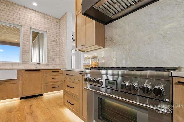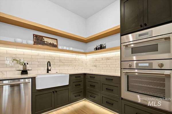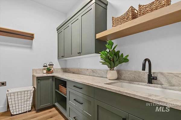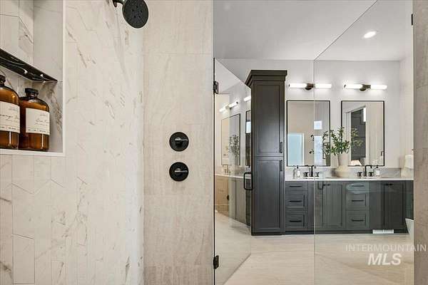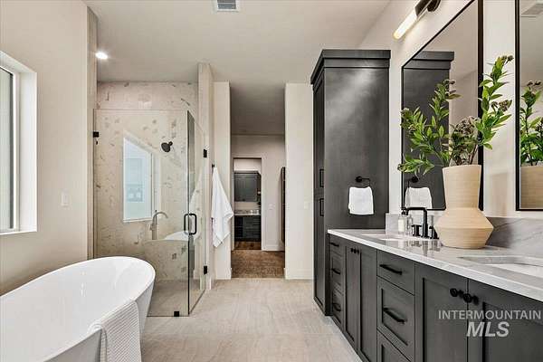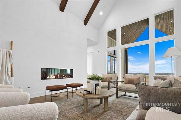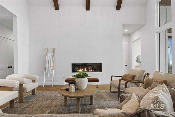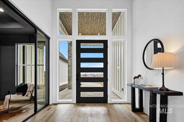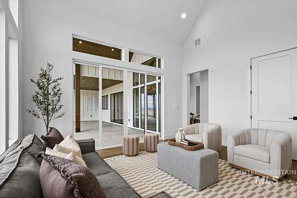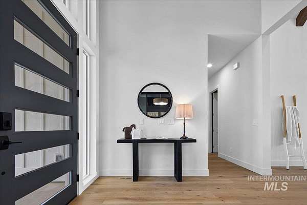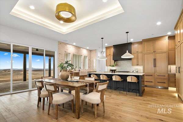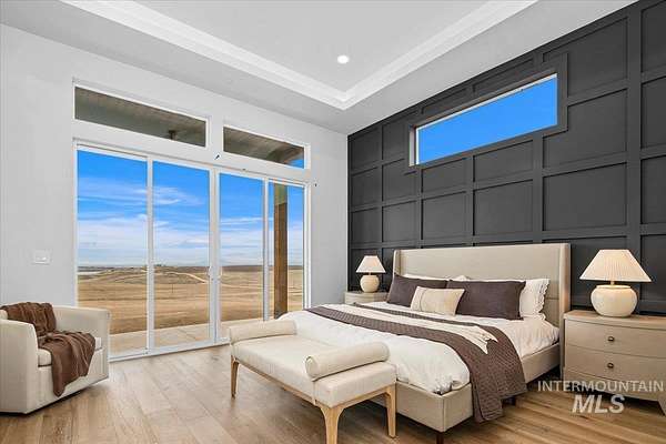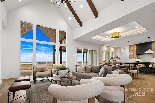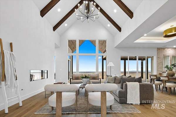 Must see lake views! Discover luxury country living on nearly 2 acres just south of Lake Lowell. This thoughtfully designed single-story home features 4 spacious bedrooms, 3.5 bathrooms, an office and large bonus room not included in bedroom count, and an impressive 52' RV bay in addition to the 3-car garage perfect for all your toys and storage needs. Enjoy elevated living with built-in Thermador appliances including built-in fridge, two dishwashers, hidden prep kitchen, and designer finishes throughout such as hard surface (quartzite) countertops, engineered hardwood floors and motion activated toe-kick and soffit lighting. 60" Indoor Heat & Glo Primo Fireplace, covered patio with cedar wood planks. Expansive windows frame scenic views of Lake Lowell, offering the peace of rural living just minutes from Nampa's conveniences.