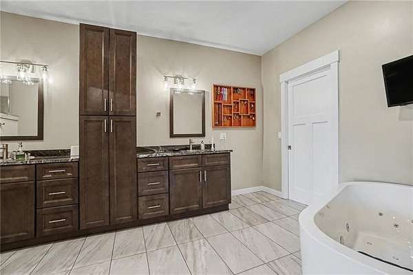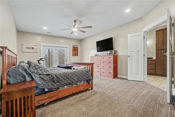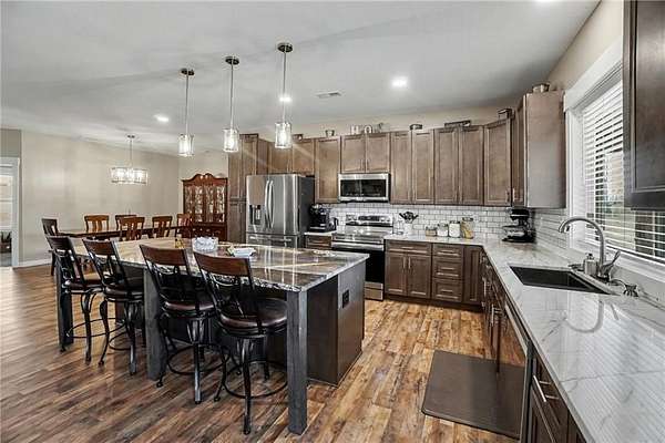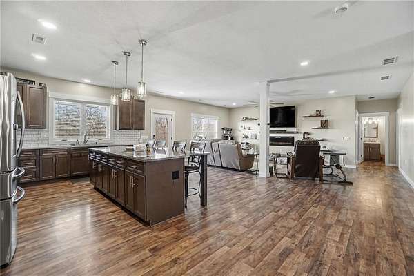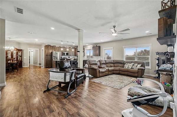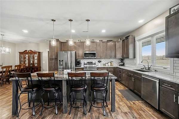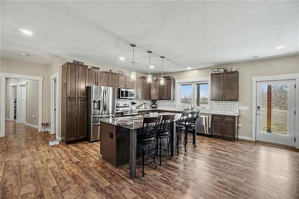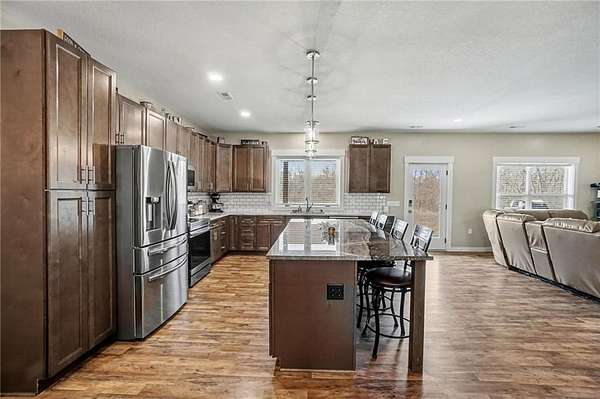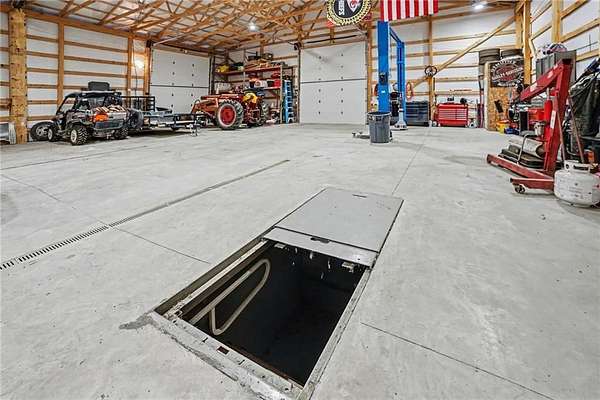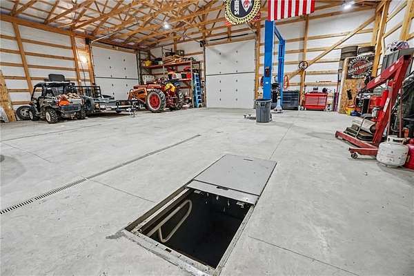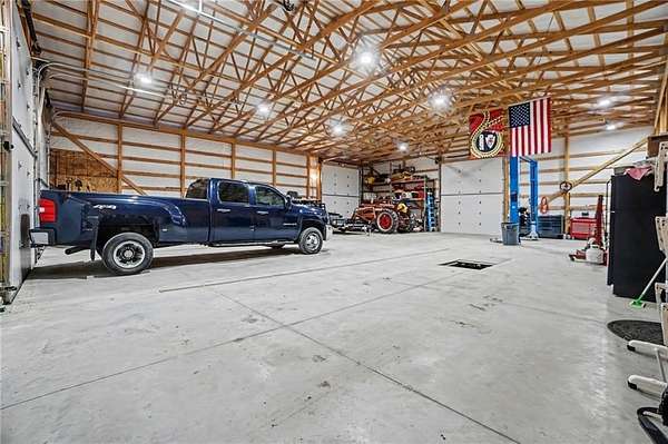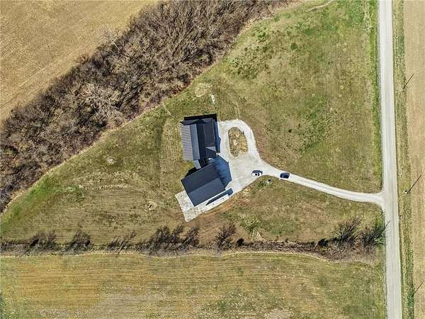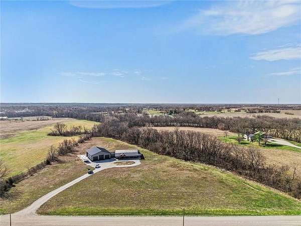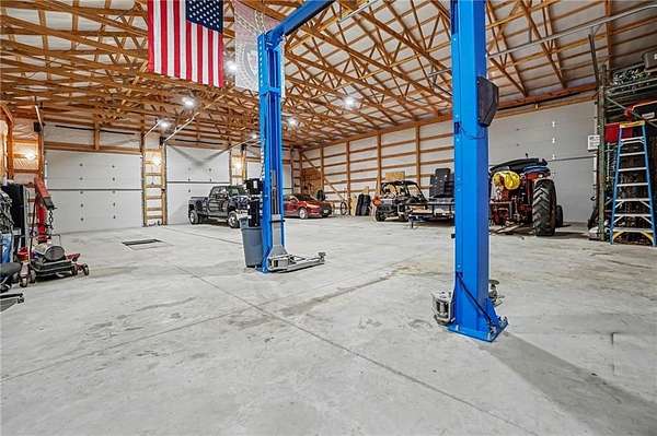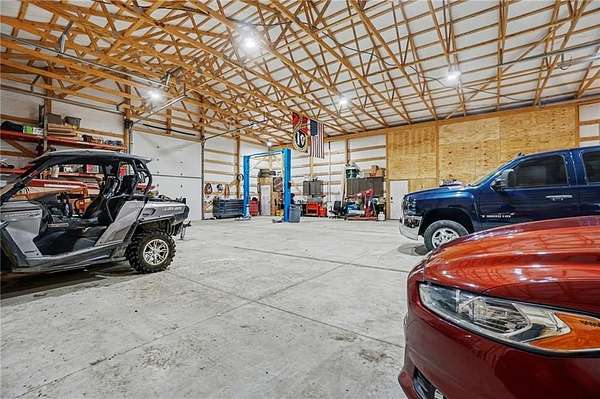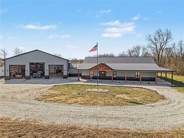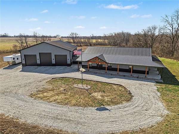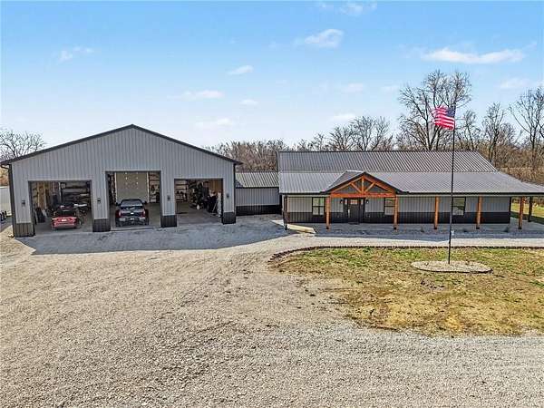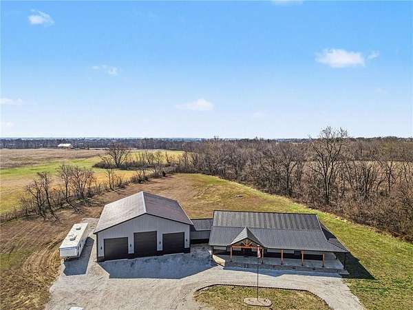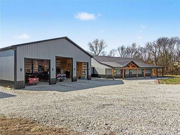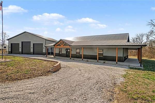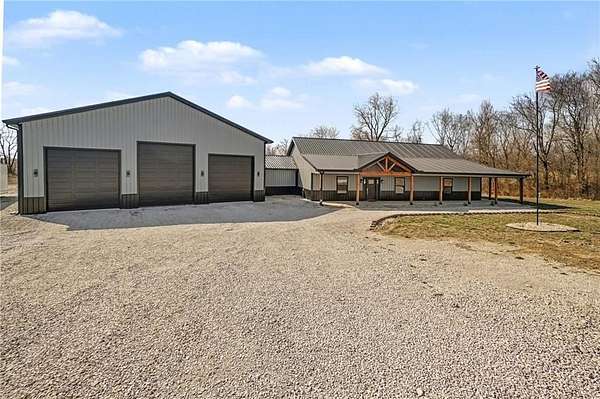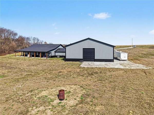 Looking for the perfect set up right outside the hustle and bustle of the city? Don't miss this custom built 4 bedroom, 2.5 bath barndominium on 10 acres! No detail left behind. Large circle drive welcomes you to a modern exterior with large covered front porch. Open floor plan with dining space, spacious walk-in pantry, & kitchen with over-sized granite island, tile backsplash, & stainless steel appliances. Living room w/ fireplace and walk out patio doors to covered back patio. Primary bedroom w/ en-suite. Spacious walk-in closet, dual vanities w/ granite, built ins, oversized walk-in tiled shower, & separate jacuzzi tub. Two additional bedrooms w/ jack & jill shared bath. 4th bedroom at the front of the home perfect for a home office. Full sized laundry room w/ storage built-ins, folding space, & wet sink. Connected 3,000 sq ft shop with 5 garage doors (2-12x12 and 3-12x14 that are RV/Semi-Accessible). Home has two 200 AMP services (one to home & one to shop), 50 amp RV plug in shop & outside, 2- 30 amp welder air compressor plugs, insulated compressor closet, & under concrete slab storm shelter w/ steel sliding floor. Picturesque 10 acres w/ front & backyard space & heavily treed wood lines for privacy.