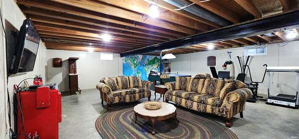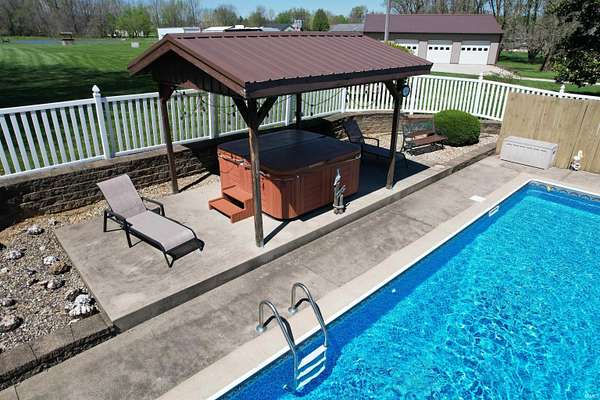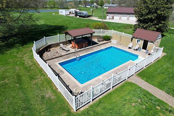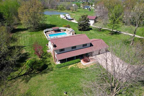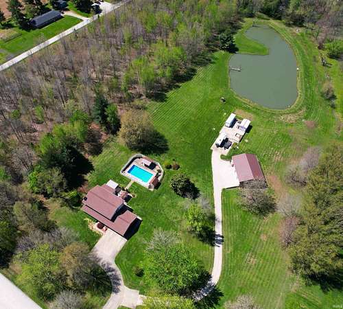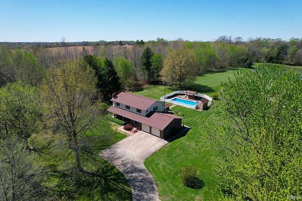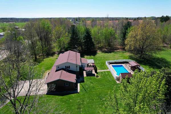 Escape to this amazing 6-acre retreat. Inside, you'll find plenty of room to grow, with 4 bedrooms, 3 full baths, 2864 sf, and a full basement ready for your finishing touches, a home gym, or extra storage. The main level features a spacious living room, kitchen with island, abundance of cabinets, & appliances to stay, a dining area, den with patio access, bedroom, & full bath with laundry area. On the upper level, you will find the primary ensuite with tray ceiling, walk-in shower, claw foot tub, & walk-in closet, 2 additional bedrooms with large closets, another full bathroom with tub/shower, dual sinks, & plentiful closets. The backyard is a true vacation-at-home destination! Float in the sparkling inground pool, relax in the hot tub, or host the ultimate summer party. Nature lovers will adore the 6 sprawling acres, complete with a stocked private pond. For the hobbyist, woodworker, or car enthusiast, the massive 36x48 outbuilding provides ample space for equipment, a workshop, or all your outdoor toys. This home has storage galore, invisible fencing for your furry friends, & even an outdoor grill with rotisserie. Whether you're looking for peaceful seclusion or a premier space to entertain, this property has it all. Enjoy the edge of town setting, with quick access to town, bypass, and I69.