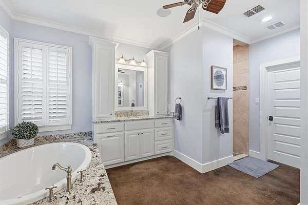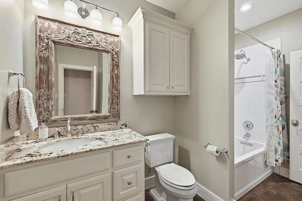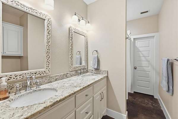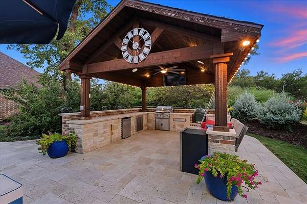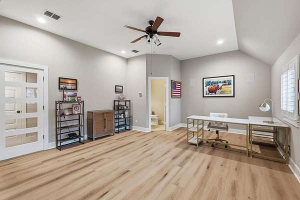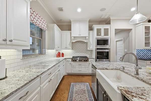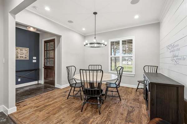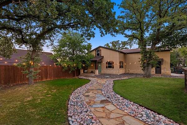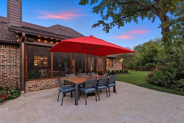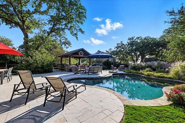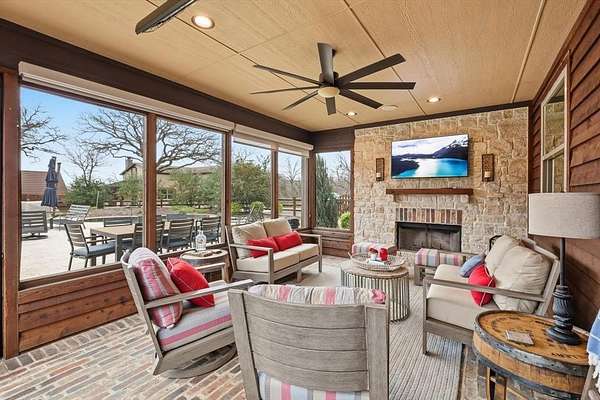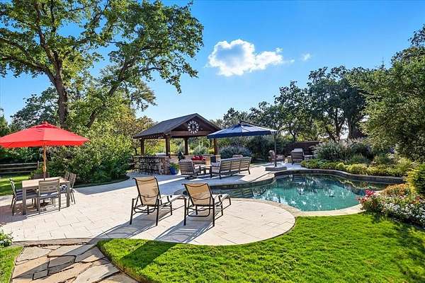 Discover this exemplary 1.5-story custom-built luxury home tucked away on a peaceful 2-acre lot in desirable Flower Mound. Spanning just over 3,100 sq. ft., the impressive main residence blends thoughtful design, comfort, and exceptional craftsmanship. A welcoming entry leads to a formal dining room that can also serve as a home office. The open-concept layout flows seamlessly into the gourmet kitchen featuring a 6-burner gas cooktop, dual ovens, under-cabinet lighting, farmhouse sink, large walk-in pantry, and a charming built-in hutch in the breakfast area for added prep space and storage. The inviting living room showcases cedar-beam vaulted ceilings, built-in cabinetry flanking a cozy gas fireplace, and a wall of windows that fill the space with natural light. The private primary suite is tucked at the back of the home and offers a tranquil ensuite bath with dual vanities, a soaking tub, large shower, and a spacious walk-in closet. Two secondary bedrooms each feature their own ensuite bath and walk-in closet. Upstairs, a versatile bonus room with a half bath is perfect for entertaining or easily used as a fourth bedroom. Step outside to your serene outdoor retreat featuring a 19x13 screened porch with a wood-burning fireplace, heaters, and surround sound speakers. Enjoy the covered pergola with a built-in Turbo grill, firepit, and a sparkling saltwater pool surrounded by lush landscaping and plenty of grassy space to play. The 39x25 workshop offers additional parking for up to four vehicles, RV or boat parking. Attached guest quarters include a living and dining area, kitchenette, bedroom, and half bath—ideal as a private guest suite, income-producing apartment, or man cave. Additional expansion potential awaits in the 40x26 floored attic space. With its exceptional craftsmanship, versatile spaces, and resort-style outdoor amenities, this one-of-a-kind property offers the perfect blend of luxury, comfort, and endless possibilities.