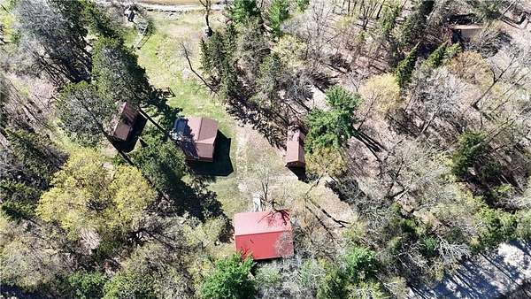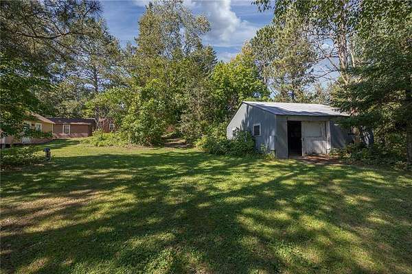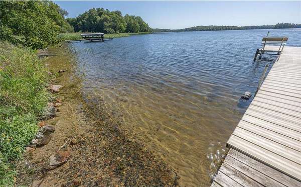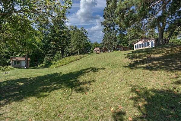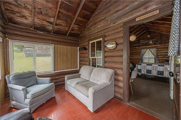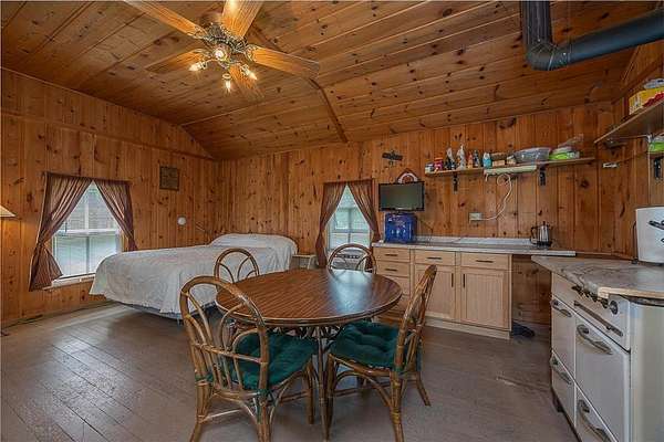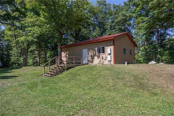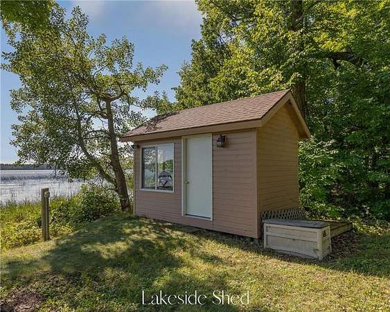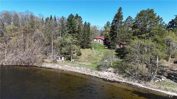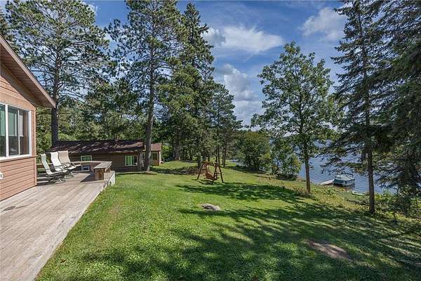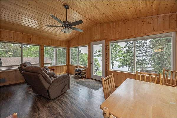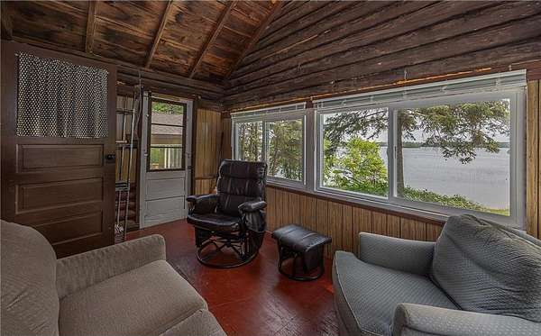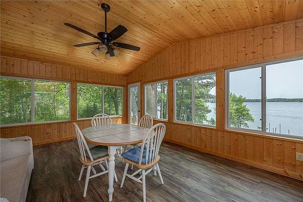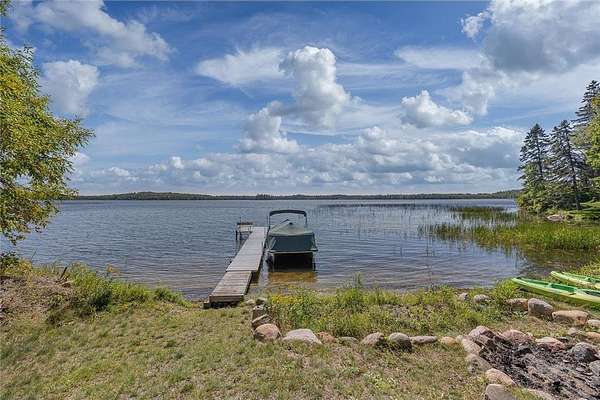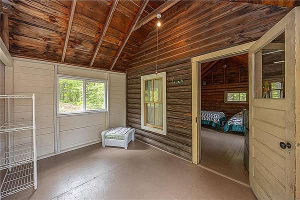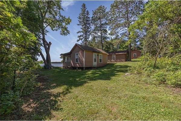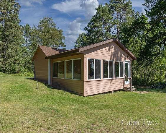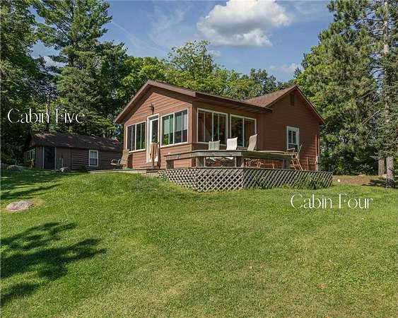 The cabins are true to their roots, built from original whole logs with wood floors and timeless character. Each has cold water and electricity. The largest cabin features a wide lake-facing porch, warm knotty pine interiors, wood floors, a kitchen area, refrigerator, sleeping space, and an expansive wraparound deck designed for relaxed gatherings or quiet mornings in the sun. Another cabin features vaulted wood ceilings and log walls, while another showcases knotty pine charm and its own porch. There's a generous yard for outdoor games or lakeside lounging, plus a beach area for swimming and summer fun. A shed with large windows offers potential as a bunkhouse. A spacious pole barn is included and is equipped with hot water, a stove for cooking, two bathrooms with two separate showers and ample room for boats, vehicles, or outdoor gear. All together, the cabins and finished space in the pole barn offer a total of 4 bedrooms, 2 bathrooms, and 1,937 square feet of living space, providing a flexible setup for hosting family, friends, or simply enjoying a quiet retreat with room to spread out. As a bonus, Wabedo Lake connects to Little Boy Lake, giving you access to two lakes from one dock. This offers more to explore, whether you're fishing, boating, or simply soaking in the landscape. Whether it's the history in the log walls, the expanse of land, or the dual-lake access that draws you in, this property delivers a rare kind of escape, unpolished in the best way.