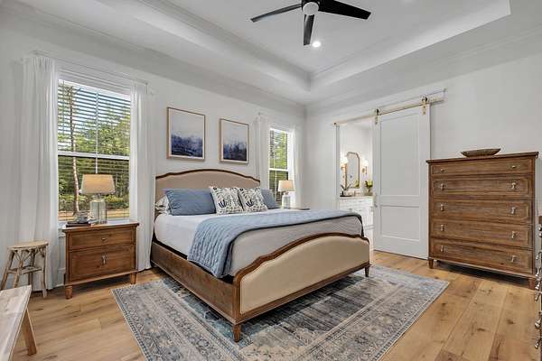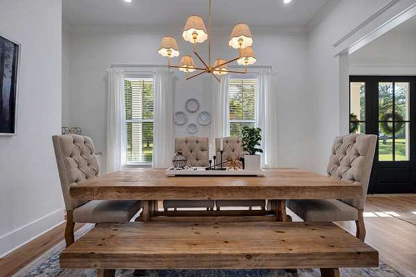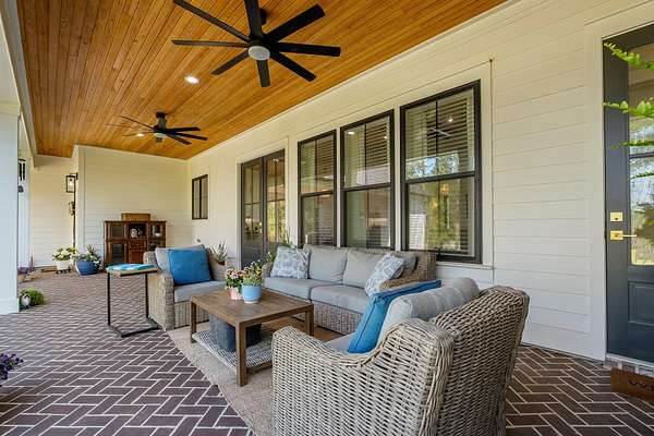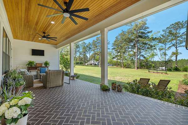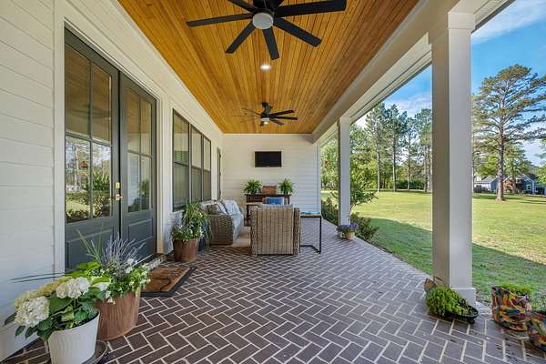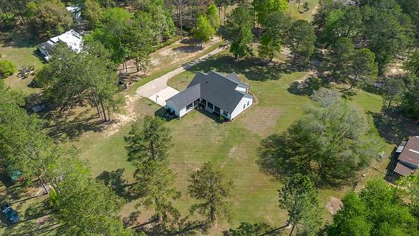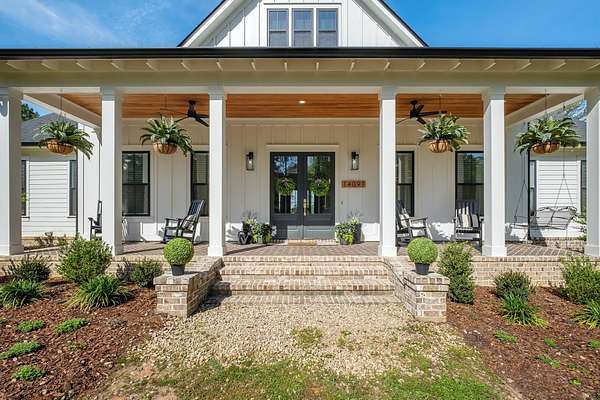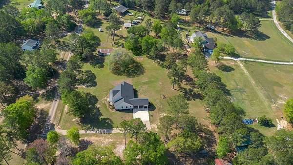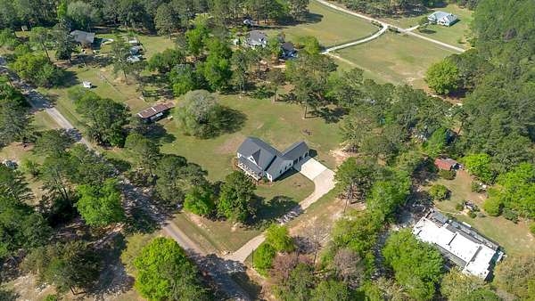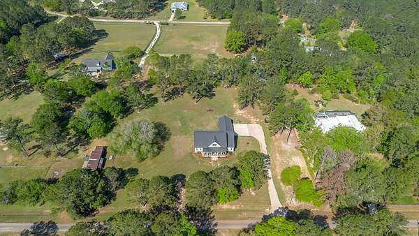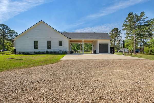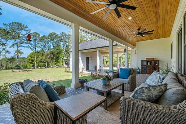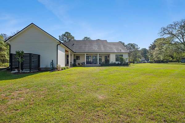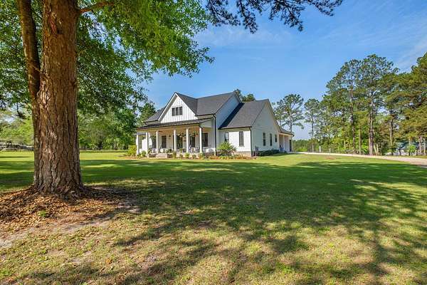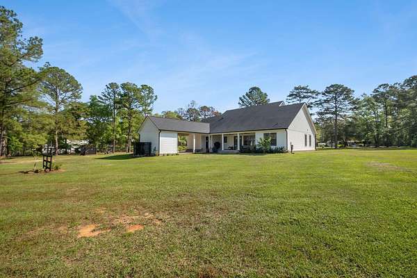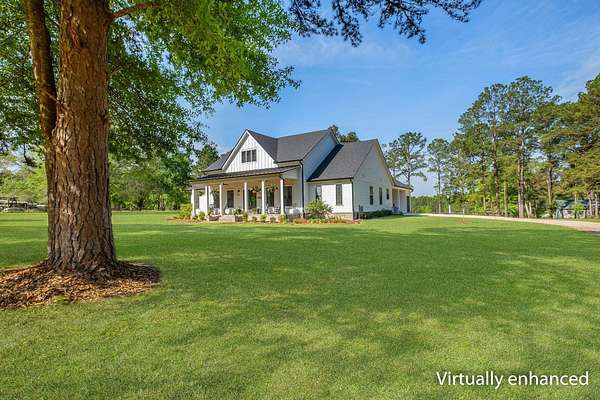 Stunning in every sense, this exceptional Southern Living-inspired home is gracefully situated on nearly three acres of beautifully open property, offering both space and serenity. Designed with comfort and functionality in mind, the home features abundant storage throughout and an impressive open-concept kitchen complete with leathered quartz countertops, extensive cabinetry, and an oversized walk-in pantry. Filled with natural light, the interior boasts soaring 10- and 11-foot ceilings, creating a bright and airy ambiance. The thoughtfully designed floor plan includes four spacious bedrooms, a dedicated office, and three full bathrooms. The private primary suite is a true retreat, highlighted by elegant tray ceilings, a luxurious spa-like bath with an expansive walk-in shower, and a custom walk-in closet with built-ins to accommodate every need. A separate guest wing provides added privacy and includes its own walk-in closet and bath. Enjoy outdoor living at its finest with a welcoming front porch perfect for rocking chairs and a swing, as well as a generous rear porch featuring a tongue-and-groove ceiling-ideal for relaxing while taking in peaceful surroundings and breathtaking sunset views. Additional highlights include a large, well-appointed laundry room with sink, refrigerator, ample storage, and a craft area; a spacious carport with extra parking; and a workshop with a roll-up door. The backyard is equally impressive, featuring an outdoor shower and pre-wiring for a generator or future pool installation. This remarkable property offers the perfect blend of elegance, comfort, and functionality in a picturesque setting. Front lawn image has been virtually enhanced.