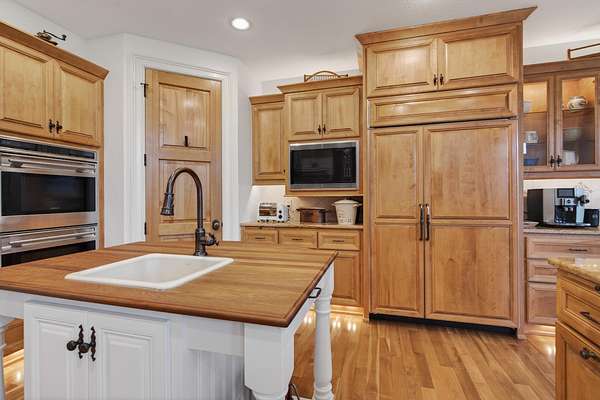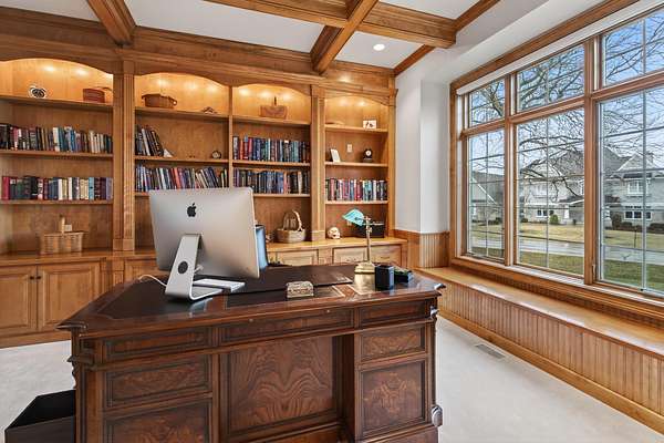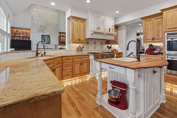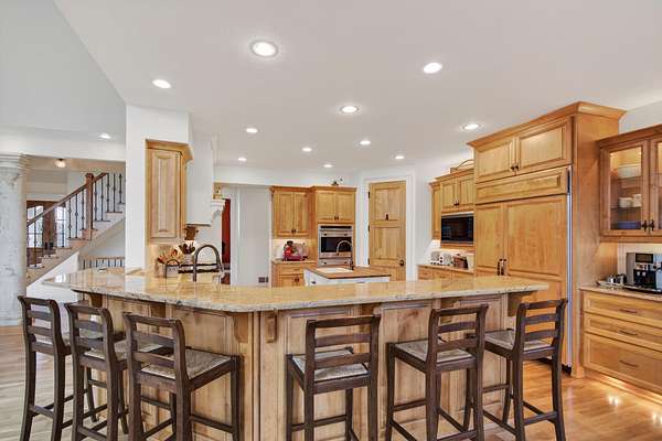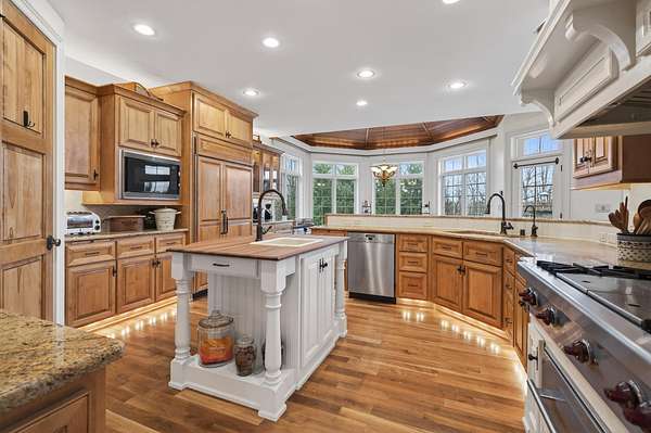Your dream home awaits in Hawks Bluff. This former Parade of Homes model offers 5 bedrooms, 4.5 bathrooms--designed to impress at every turn. The gourmet kitchen features built-in appliances, a center island with breakfast bar, and flows seamlessly into a sunroom-style dinette. The great room showcases Venetian plaster walls, a limestone natural fireplace, and architectural columns for added character. The main-level primary suite is a true retreat, complete with a coffee bar and private patio access. Additional highlights include a first-floor study and second-floor library. The walkout lower level is built for entertaining, featuring a stunning stone fireplace, theater room, 700-bottle wine cellar, billiards area, and private guest suite.