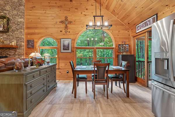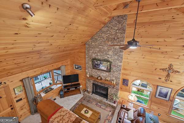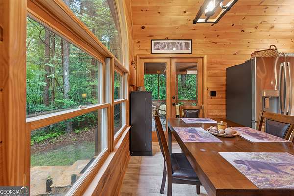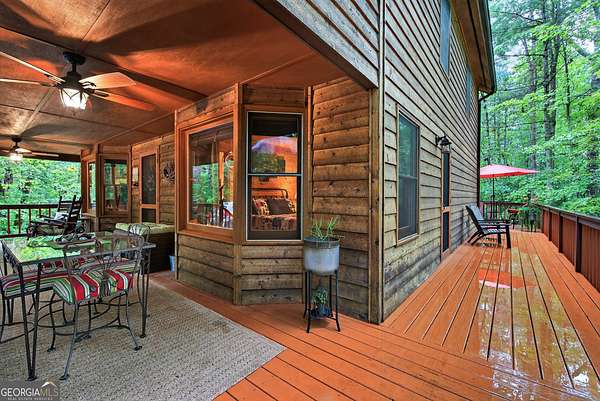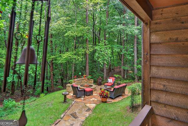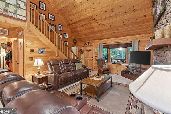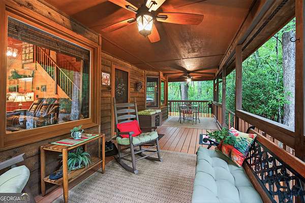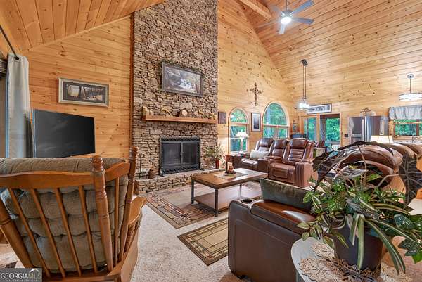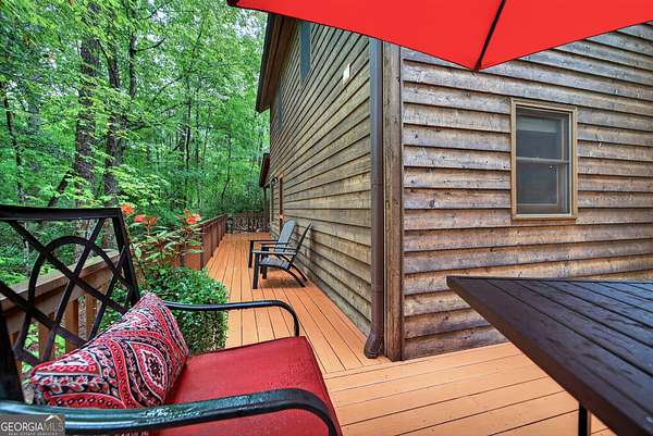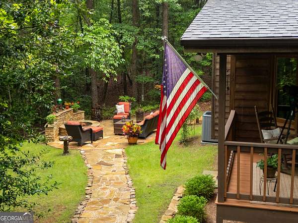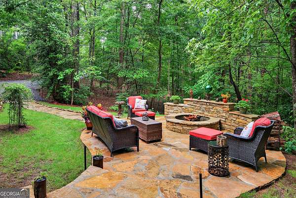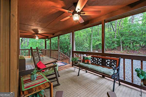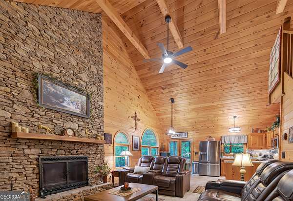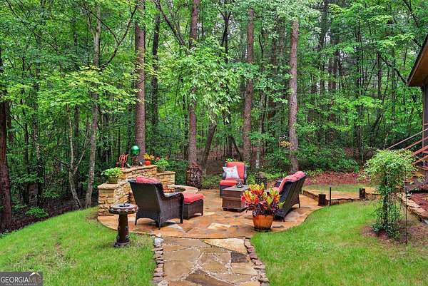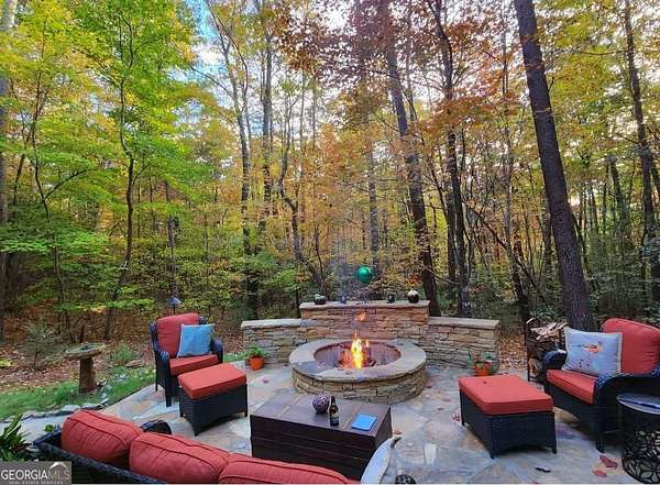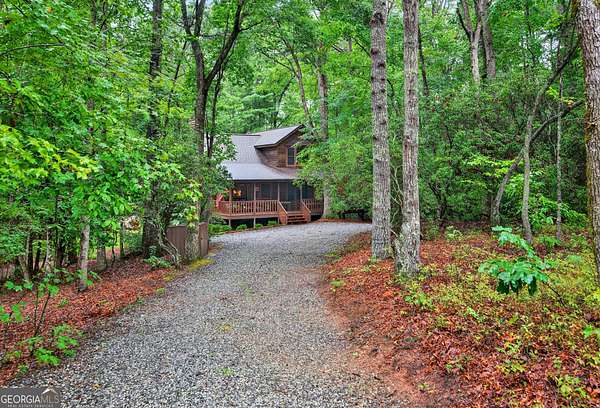 Nestled in the heart of Sautee Nacoochee, this picturesque 2-acre cedar cabin features cathedral ceilings and custom interior finishes, all surrounded by wooded tranquility. It's a quiet retreat just minutes from the charm of Helen and the beauty of the Chattahoochee National Forest. Upon entry, you'll immediately notice the floor-to-ceiling stacked stone fireplace, pristine tongue-and-groove paneling, and a newly renovated kitchen. The home has been thoughtfully updated-meticulously cared for by its owners, and it shows! With 2 bedrooms and 2 full bathrooms-one on each level-the layout offers comfort and privacy. The upstairs master suite feels like your own luxurious treehouse, perched among the treetops. Additional features include a screened porch (already wired for hot tub) for enjoying crisp mountain air and a generous wraparound deck that spans the entire front of the home. It's adorned with stately exterior fans and a custom firewood box, ideal for hosting or unwinding. Step outside and you'll find a serene woodland retreat, perfectly designed for comfort and connection. A beautifully crafted stone patio anchors the space, surrounded by lush forest greenery that provides natural privacy. A central stone fire pit invites cozy evenings under the stars, while a low stone wall adds rustic charm. A graceful stone pathway leads to the patio, beckoning guests to explore and unwind. The entire outdoor setting feels like an extension of the forest-peaceful, inviting, and thoughtfully arranged for both relaxation and entertaining. Since 2018, the owners have taken exceptional care of this home. Upgrades include a new roof, HVAC system, fireplace cap and vent pipe, lighting, flooring, blinds, a whole-house water filter, water pressure tank, appliances, counters, backsplash, fiber internet, and more. The seasonal mountain views are stunning, and the expansive outdoor living space adds even more appeal. All of this is conveniently located near local wineries, hiking trails, and river adventures-your gateway to mountain living.