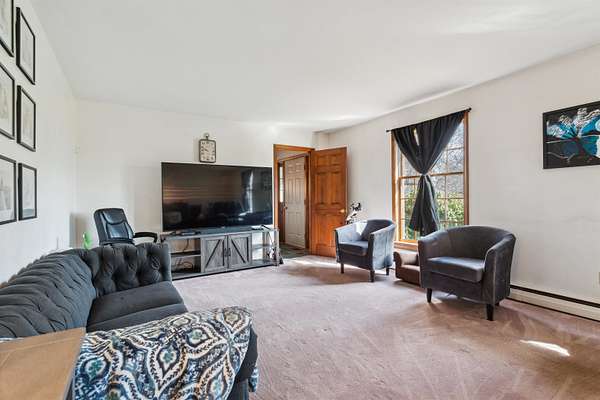 Welcome to this beautifully maintained expanded Cape, perfectly positioned to capture stunning views of the Hartness runway--an aviation enthusiast's dream! Tucked away on a quiet dead-end road, the property offers just the right balance of privacy and convenience, located only 15 minutes from everyday essentials. The main level features a spacious open-concept living and dining area, a lovely primary suite with a walk-in closet and a bath complete with a walk-in shower, a fully equipped kitchen, laundry room, formal entryway, and a large office with a private entrance--ideal for working from home or welcoming guests. Upstairs, you'll find three additional bedrooms and a finished bonus room ready for your creative touch. The oversized heated two-car garage is attached for year-round comfort, and a stone patio off the expansive rear deck is perfect for outdoor entertaining. The level lot is beautifully landscaped and includes a charming woodshed and a peaceful stream, creating a truly delightful country setting.