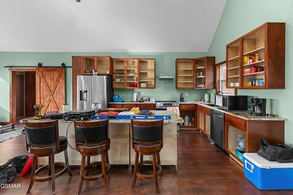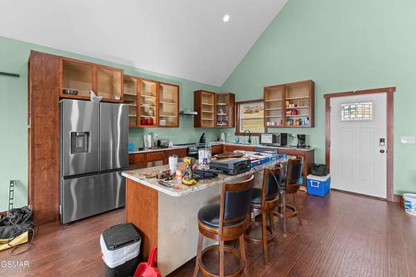 This nearly finished, absolutely charming cabin complete with a million-dollar view offers the perfect opportunity for full-time living, a peaceful personal retreat, or an exceptional overnight rental. The panoramic vista will take your breath away, and the interior is just as impressive. Thoughtfully designed and custom built, the home features durable LVP and tile flooring throughout. The stunning bathroom showcases a luxurious tiled shower with custom marble walls and flooring that truly elevate the space. Barn doors add rustic charm, and a beautifully stained tongue-and-groove feature wall frames the wall of windows that perfectly capture that incredible view. The kitchen is outfitted with granite countertops and custom cabinetry (doors arriving soon), offering both style and functionality. Through another barn door, you'll find a well-appointed laundry room complete with a brand-new washer and dryer that leads directly to the covered back deck, perfect for relaxing evenings outdoors. The back-deck ceiling will soon be finished with tongue-and-groove, complemented by substantial stained wood posts on both porches for a high-end, craftsman feel. Outside, a storage building provides additional convenience and space for tools or recreational gear. This cabin is the ideal blend of cozy charm, modern finishes, and an unforgettable views ''don't miss your chance to make it yours.
