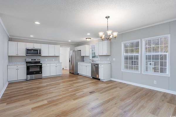 Welcome home to this 3-bedroom, 2-bath double wide manufactured home sits on a spacious 1.88-acre parcel with no homeowner's association and a 17 x 28 detached garage/storage building. The interior shines with all-new luxury vinyl plank flooring, fresh paint throughout, and plush new carpeting in the bedrooms, while the modern kitchen boasts brand-new cabinets, countertops, fixtures, and sleek stainless-steel appliances. The thoughtful split floor plan provides a generous living room and a separate family room for versatile entertaining or relaxing, plus all three bedrooms feature new ceiling fans. Both bathrooms have updated vanities and sinks, and a handy small nook between the smaller bedrooms is ideal for a home office, reading area, or cozy den. Step outside to enjoy two large decks perfect for outdoor living, along with a huge detached garage/storage building for vehicles, tools, or hobbies. Conveniently located just a short drive from downtown Loris, shopping, and restaurants, this move-in-ready gem offers affordable country comfort with recent upgrades throughout--don't miss your opportunity to make it yours!