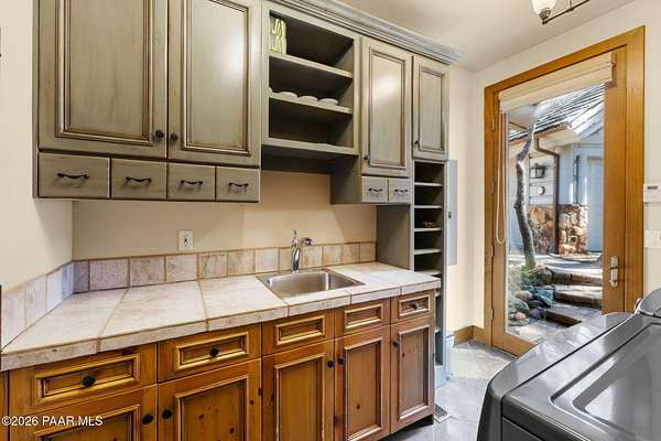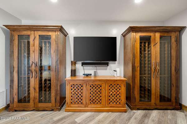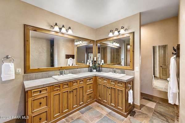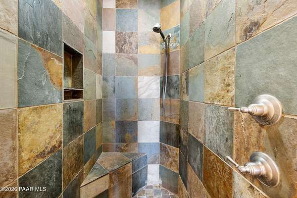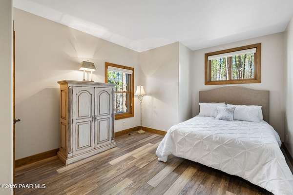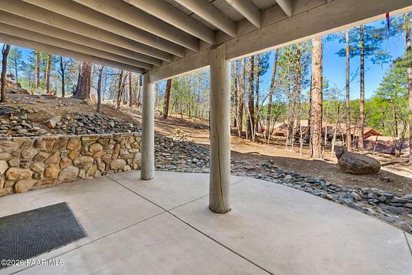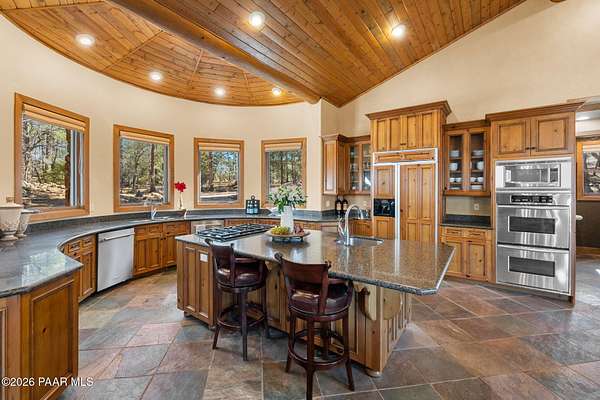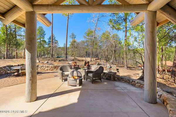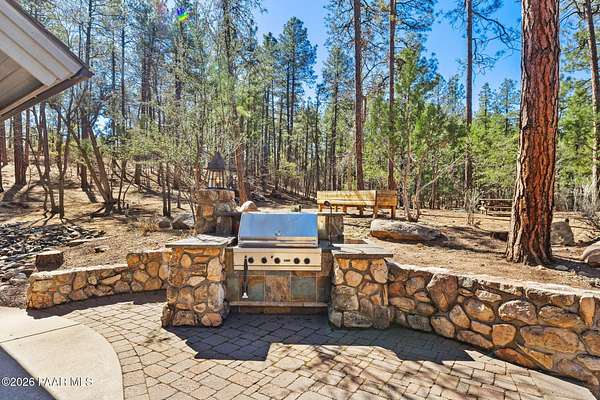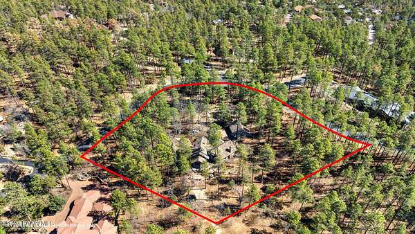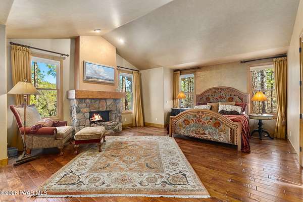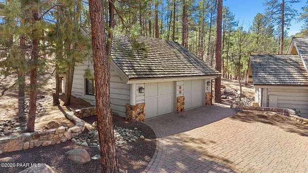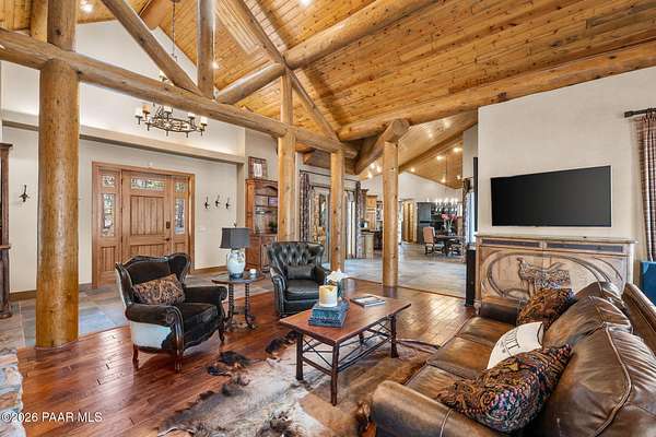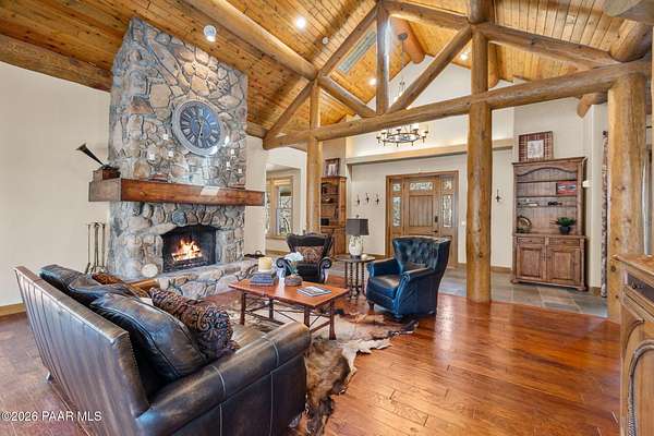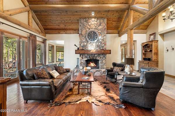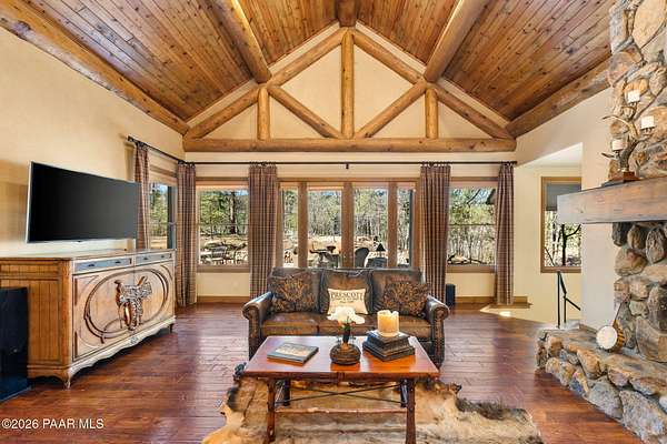 Nestled among towering ponderosa pines in the prestigious gated community of High Valley Ranch, this enchanting luxury cottage sits on 2.07 private acres. A graceful curving driveway welcomes you to a serene mountain retreat where privacy, nature, and timeless craftsmanship come together.The 3,707 sq ft home offers comfortable main-level living with a spacious primary suite, while two additional ensuites downstairs provide ideal guest accommodations along with a cozy sitting area and wine cabinets. Stunning log beam ceilings and a magnificent natural stone wood-burning fireplace anchor the living room, creating a warm mountain retreat. Wood and slate floors add timeless character throughout. The gourmet kitchen features curved counters, two ovens, two dishwashers, warming drawer, prep sink in the island, and a charming fireplace lounge area perfect for gathering. The spacious primary suite offers a private deck to enjoy morning coffee among the pines and a cozy stone fireplace for quiet evenings. Outdoor living is exceptional with a large entertaining patio, built-in BBQ, and peaceful deck surrounded by nature--perfect for relaxing or hosting guests. This High Valley Ranch residence captures the essence of Prescott luxury living--elegant, private, and surrounded by nature, yet just minutes from downtown Prescott and nearby hiking and biking trails.