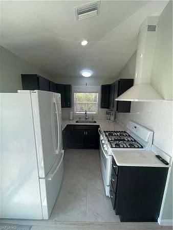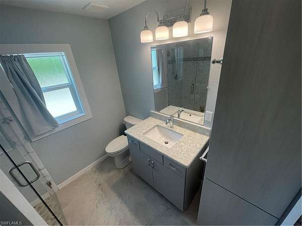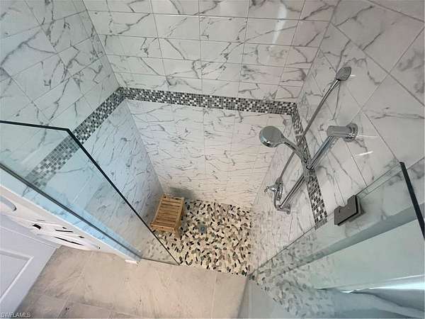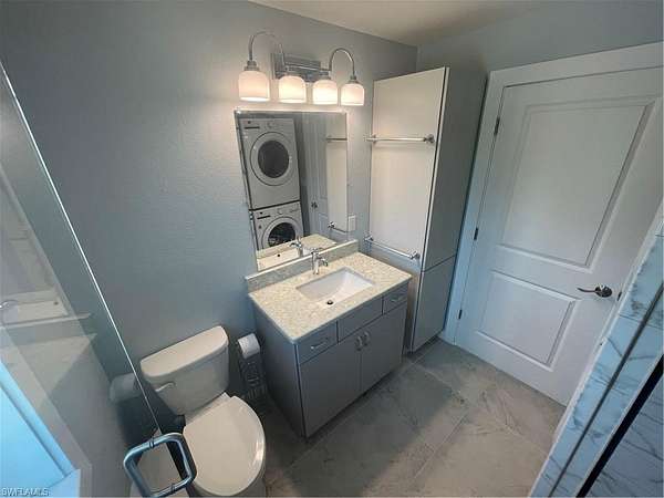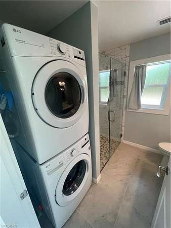 The coach house showcases cinder block construction, impact-resistant hurricane-rated windows, and central air conditioning for year-round comfort. Inside, enjoy a full kitchen with gas stove/oven, premium appliances, soft-close solid wood cabinetry, and solid surface countertops. The spacious bathroom features a floor-to-ceiling tile shower with glass entry, while a stack washer and dryer and gas water heater add convenience and efficiency.