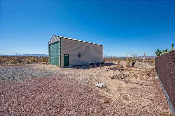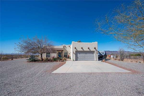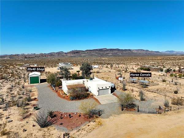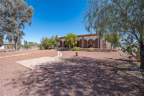 If you've been dreaming of space, views, and total peace and quiet, this Yucca property might be exactly what you ve been waiting for. Set on 2.35 acres and less than 10 minutes from paved Alamo Road, this Santa Fe style home gives you that perfect balance of feeling tucked away while still being easy to get to. The setting is pure desert serenity, wide open skies, gorgeous Ocotillo, and the kind of quiet you can actually hear. The home offers 1,413 square feet with a bright, open layout that feels welcoming the moment you walk in. The kitchen flows right into the living area, making it great for everyday living or having friends over, and features stainless steel appliances, a large pantry, and beautiful Talavera tile that adds just the right amount of Southwest character. The architecture throughout the home has that timeless Santa Fe charm that never goes out of style. You'll also love the big-ticket updates already done for you, including a newer HVAC system (about 2 years old) and a brand new roof, so you can move in with peace of mind. The primary suite is a true retreat with two oversized walk-in closets, a spacious bathroom with a soaking tub, walk-in shower, dual sinks, and big windows that let in tons of natural light. Step out back and you'll find a covered patio with gorgeous archways, the perfect place to sit, relax, and take in those wide-open desert views or unwind in the hot tub as the sun sets. The backyard is fenced and surprisingly lush, with producing orange and lemon trees, pistachio trees, and palms. Outside the fence, there's plenty of room for animals, including horse setup with shaded mare motels and no-climb fencing. Now let s talk about the garage space, because this is a big one. In addition to the 2-car attached garage, there s a huge 20x40 detached shop/garage. Between the two, you have space for up to 6 vehicles, plus room for a workshop, toys, or storage. Whether you're a car enthusiast, need space for projects, or just want room for all your gear, this setup is hard to beat. And the views they re exactly what you want out here. Big skies, beautiful desert scenery, and sunsets that never get old. This isn't just a house. It s a peaceful desert retreat with space to breathe, space to work, space to play, and a view that reminds you why you chose Arizona in the first place.