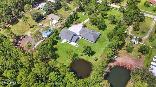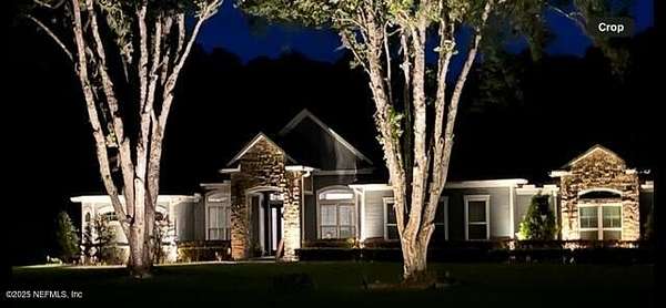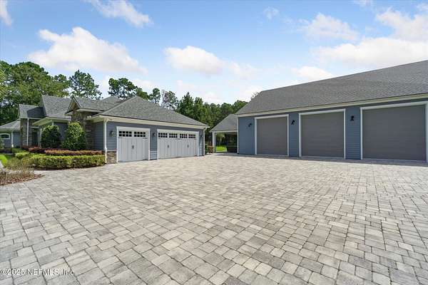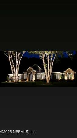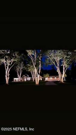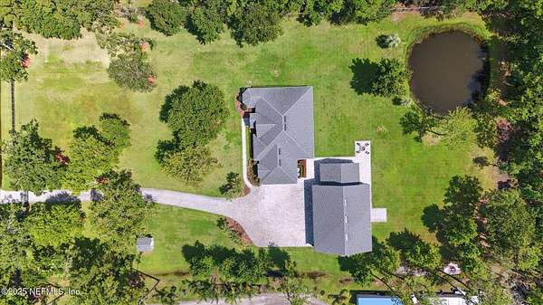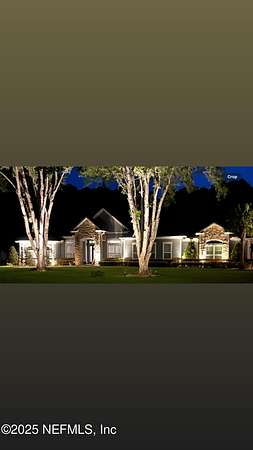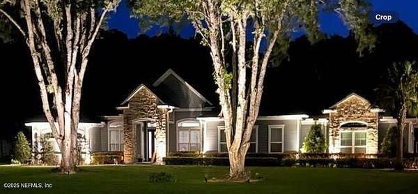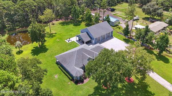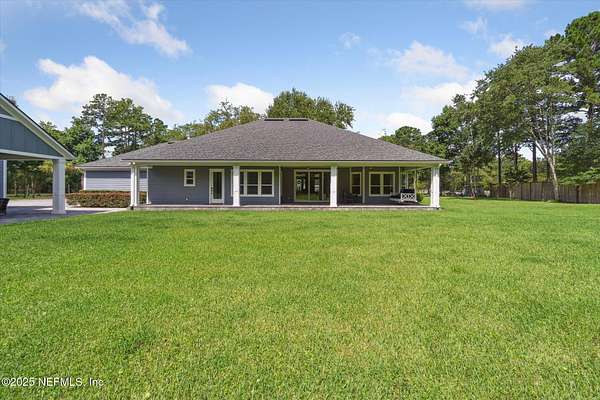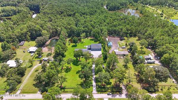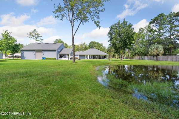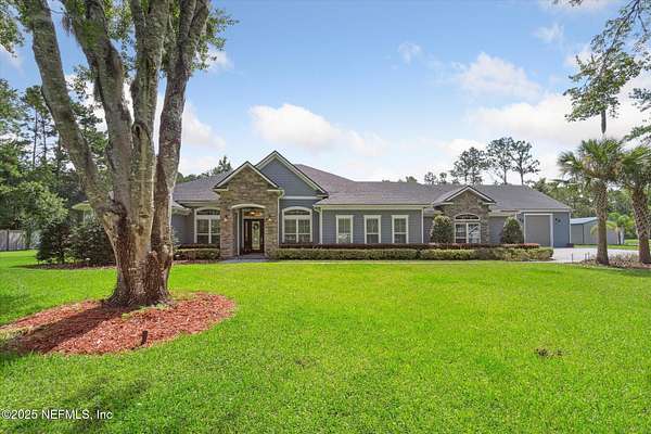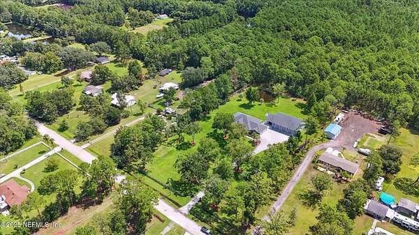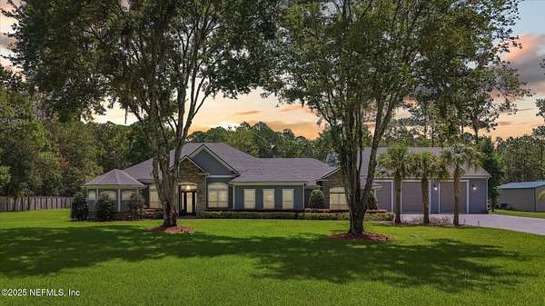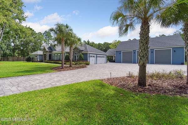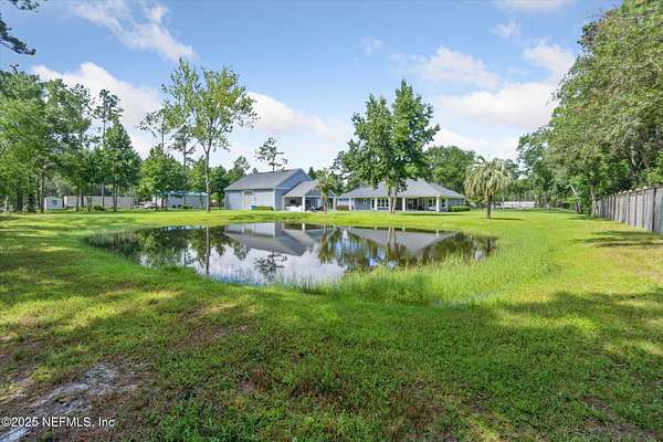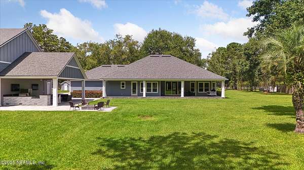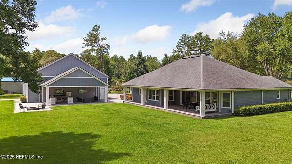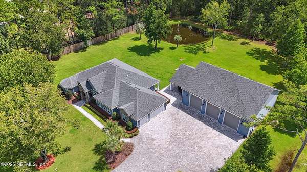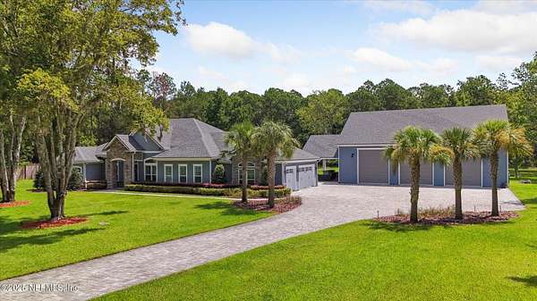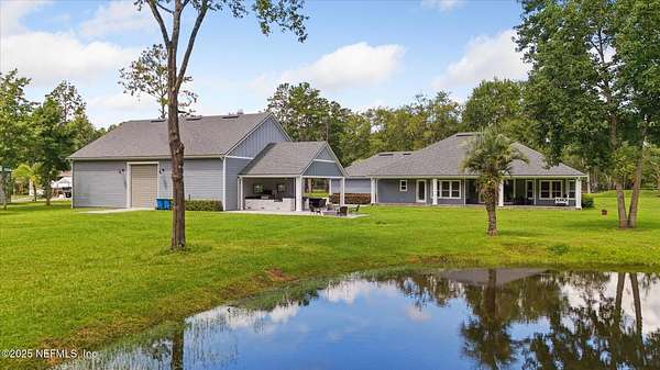 Experience luxury country living in Jacksonville, Florida at this meticulously designed estate on Denton Road. This stunning custom-built home blends high-end craftsmanship with modern comfort in a peaceful setting-perfect for holiday entertaining or cozy winter gatherings by the dramatic 72'' floor-to-ceiling stone fireplace. The open-concept living space features soaring ceilings, smooth-finish walls, integrated sound, and a seamless indoor-outdoor flow through 12' x 9' glass sliders. The chef's kitchen showcases dual porcelain islands, Thermador appliances, and hidden storage. The primary suite is a private retreat with dual designer closets, a spa-style bath, soaking tub, walk-through shower, and wall-mounted fireplace. Enjoy tranquil country charm just minutes from Jacksonville beaches, shopping, and the airport-a true North Florida gem! Two bedrooms with en-suites, a dedicated home office, and formal dining with exposed beams provide both functionality and charm. Step outside to a covered back porch that spans the entire length of the home or host unforgettable gatherings in the 34' x 20' covered outdoor kitchen equipped with a grill, burner, kegerator, and bar seating for 10, all under a rich cedar ceiling with integrated AV and lighting. Car enthusiasts and hobbyists will appreciate the 60' x 50' detached garage complete with four oversized doors, a 20' x 16' workshop, loft storage, and multiple power panels. Situated on over 3 acres with a private pond, gated entry, extensive paver drive, and nearly 80 landscape lights, this estate offers next-level living that's both elevated and grounded in comfort. Every detail, from CAT 6 wiring and smart home switches to professional landscaping and full-perimeter security, has been intentionally designed to enhance your daily life.