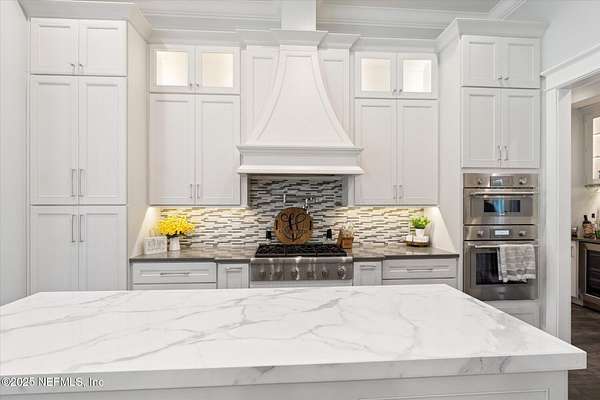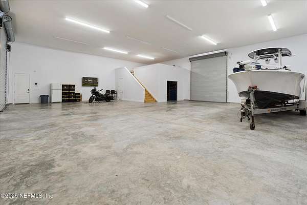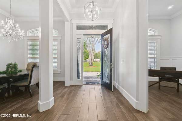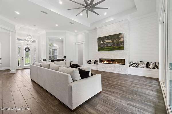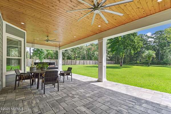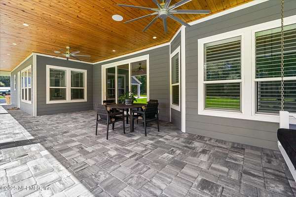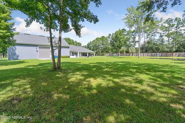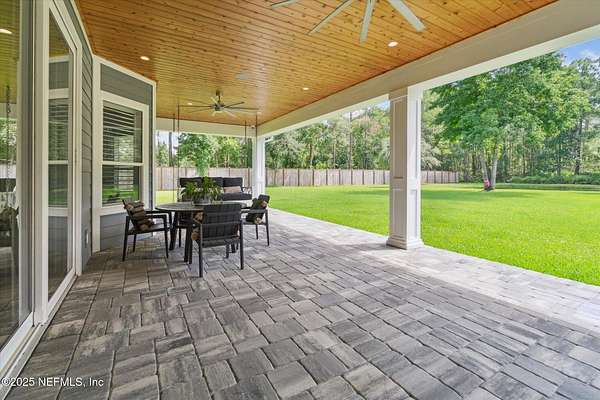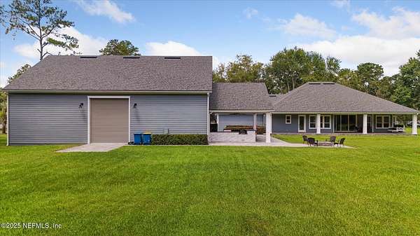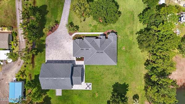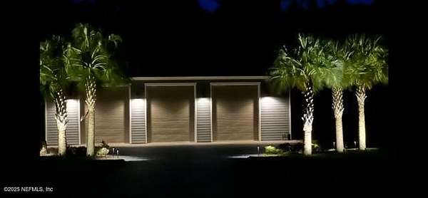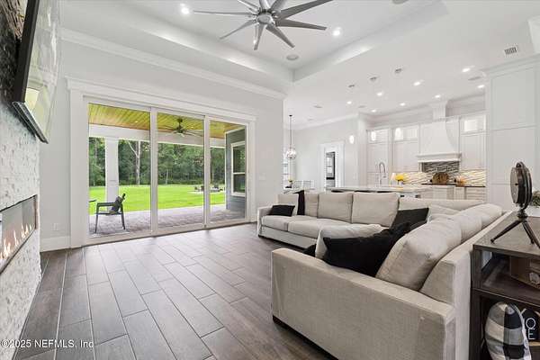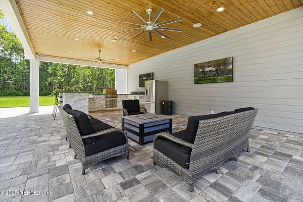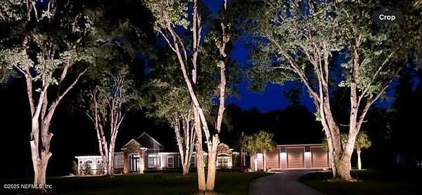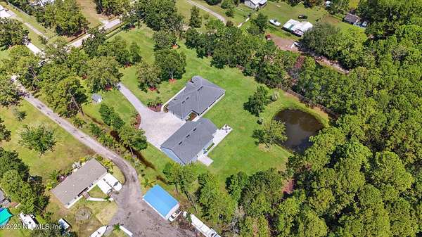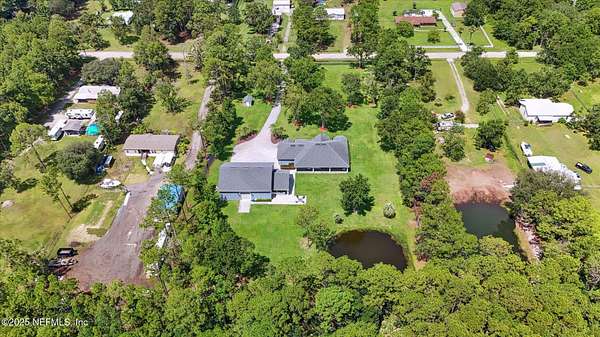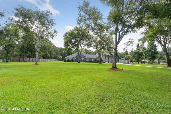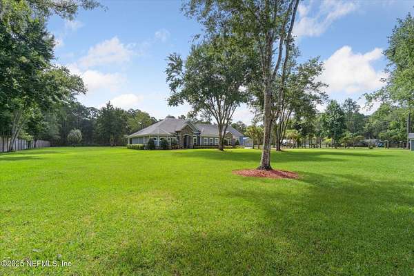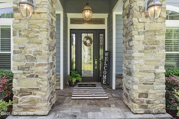 Experience luxury country living in Jacksonville, Florida at this meticulously designed estate on Denton Road. This stunning custom-built home blends high-end craftsmanship with modern comfort in a peaceful setting-perfect for holiday entertaining or cozy winter gatherings by the dramatic 72'' floor-to-ceiling stone fireplace. The open-concept living space features soaring ceilings, smooth-finish walls, integrated sound, and a seamless indoor-outdoor flow through 12' x 9' glass sliders. The chef's kitchen showcases dual porcelain islands, Thermador appliances, and hidden storage. The primary suite is a private retreat with dual designer closets, a spa-style bath, soaking tub, walk-through shower, and wall-mounted fireplace. Enjoy tranquil country charm just minutes from Jacksonville beaches, shopping, and the airport-a true North Florida gem! Two bedrooms with en-suites, a dedicated home office, and formal dining with exposed beams provide both functionality and charm. Step outside to a covered back porch that spans the entire length of the home or host unforgettable gatherings in the 34' x 20' covered outdoor kitchen equipped with a grill, burner, kegerator, and bar seating for 10, all under a rich cedar ceiling with integrated AV and lighting. Car enthusiasts and hobbyists will appreciate the 60' x 50' detached garage complete with four oversized doors, a 20' x 16' workshop, loft storage, and multiple power panels. Situated on over 3 acres with a private pond, gated entry, extensive paver drive, and nearly 80 landscape lights, this estate offers next-level living that's both elevated and grounded in comfort. Every detail, from CAT 6 wiring and smart home switches to professional landscaping and full-perimeter security, has been intentionally designed to enhance your daily life.