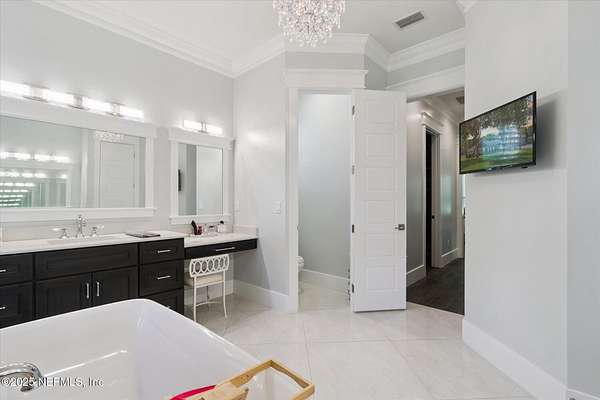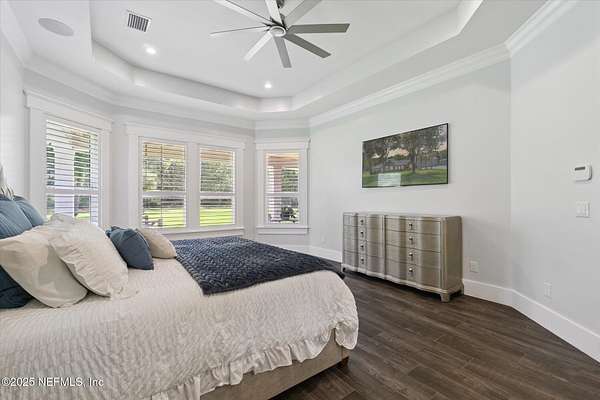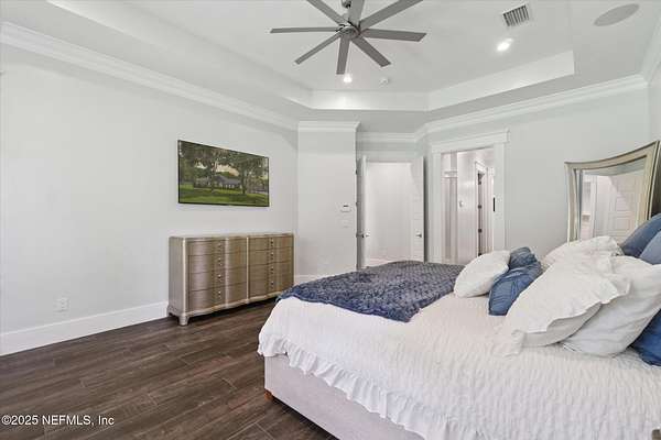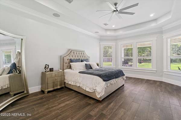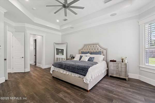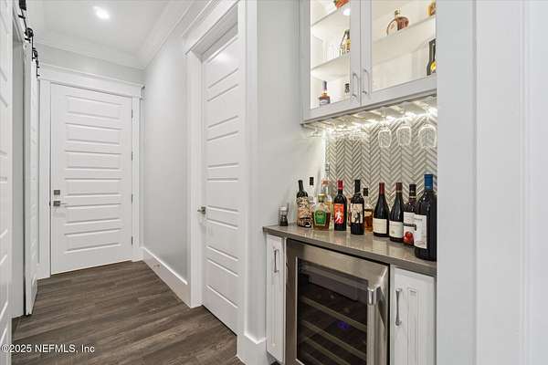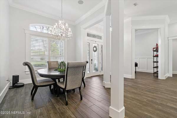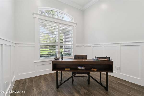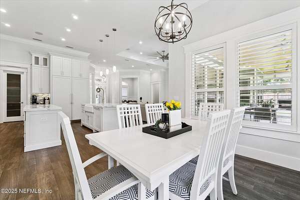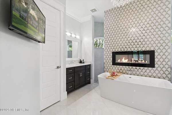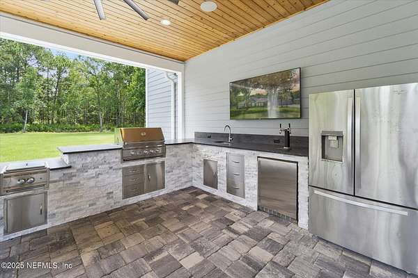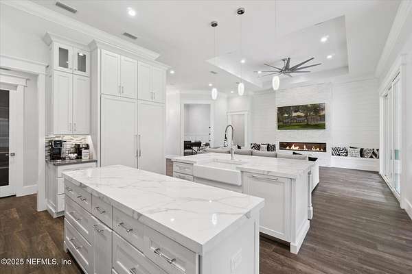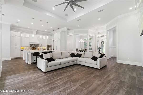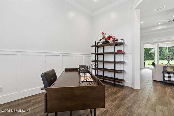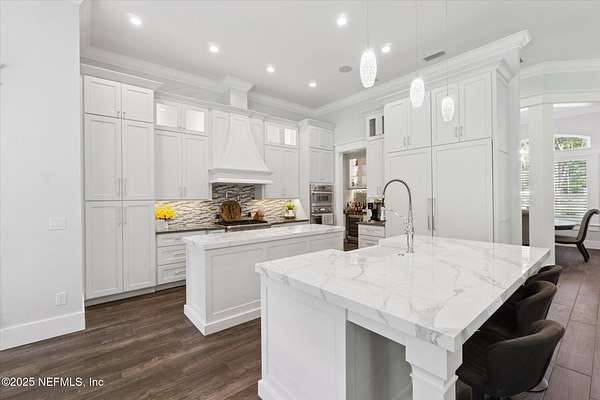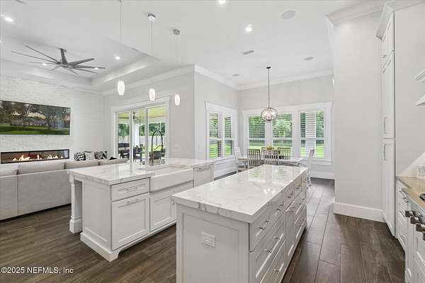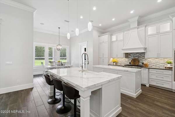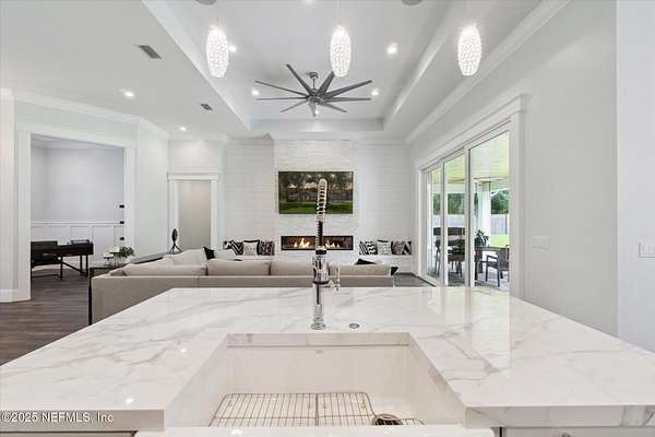 Experience luxury country living in Jacksonville, Florida at this meticulously designed estate on Denton Road. This stunning custom-built home blends high-end craftsmanship with modern comfort in a peaceful setting-perfect for holiday entertaining or cozy winter gatherings by the dramatic 72'' floor-to-ceiling stone fireplace. The open-concept living space features soaring ceilings, smooth-finish walls, integrated sound, and a seamless indoor-outdoor flow through 12' x 9' glass sliders. The chef's kitchen showcases dual porcelain islands, Thermador appliances, and hidden storage. The primary suite is a private retreat with dual designer closets, a spa-style bath, soaking tub, walk-through shower, and wall-mounted fireplace. Enjoy tranquil country charm just minutes from Jacksonville beaches, shopping, and the airport-a true North Florida gem! Two bedrooms with en-suites, a dedicated home office, and formal dining with exposed beams provide both functionality and charm. Step outside to a covered back porch that spans the entire length of the home or host unforgettable gatherings in the 34' x 20' covered outdoor kitchen equipped with a grill, burner, kegerator, and bar seating for 10, all under a rich cedar ceiling with integrated AV and lighting. Car enthusiasts and hobbyists will appreciate the 60' x 50' detached garage complete with four oversized doors, a 20' x 16' workshop, loft storage, and multiple power panels. Situated on over 3 acres with a private pond, gated entry, extensive paver drive, and nearly 80 landscape lights, this estate offers next-level living that's both elevated and grounded in comfort. Every detail, from CAT 6 wiring and smart home switches to professional landscaping and full-perimeter security, has been intentionally designed to enhance your daily life.