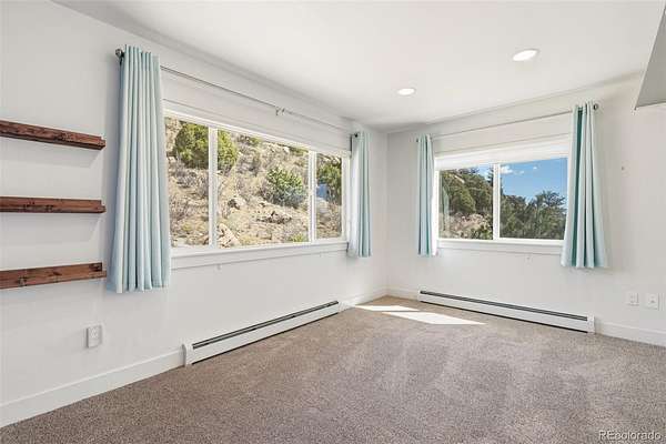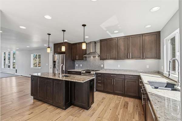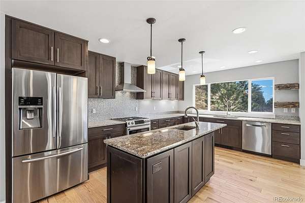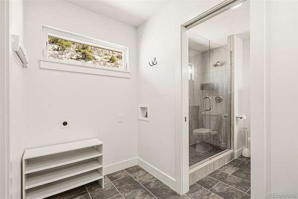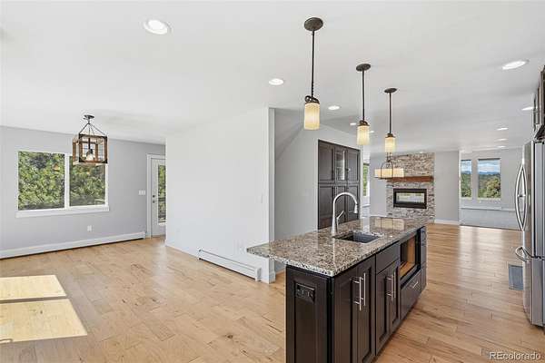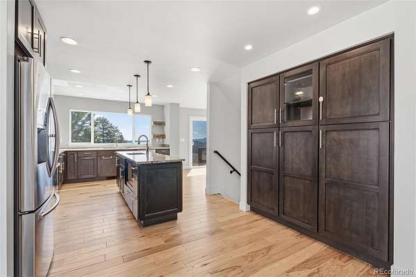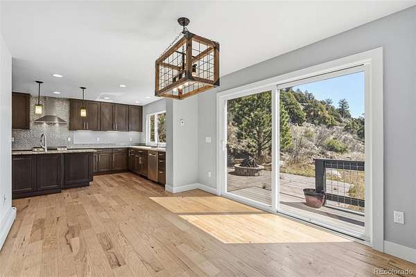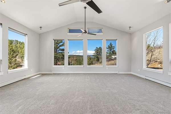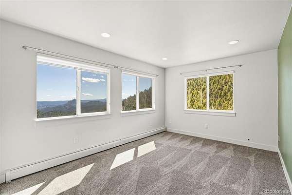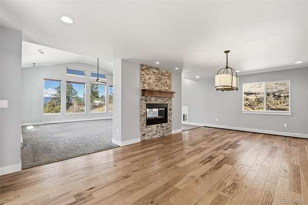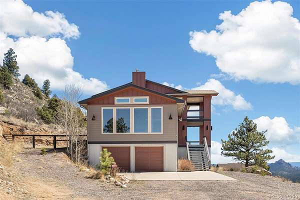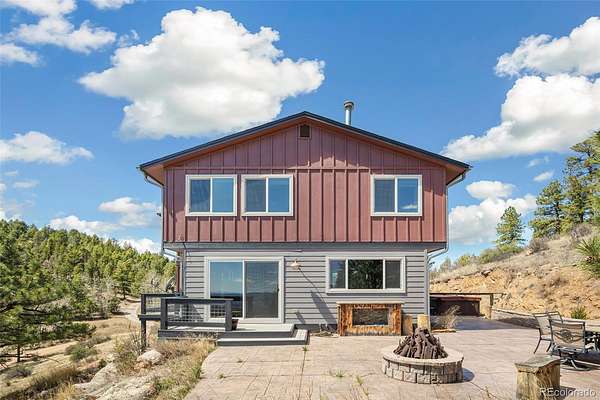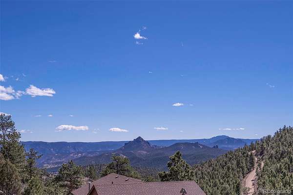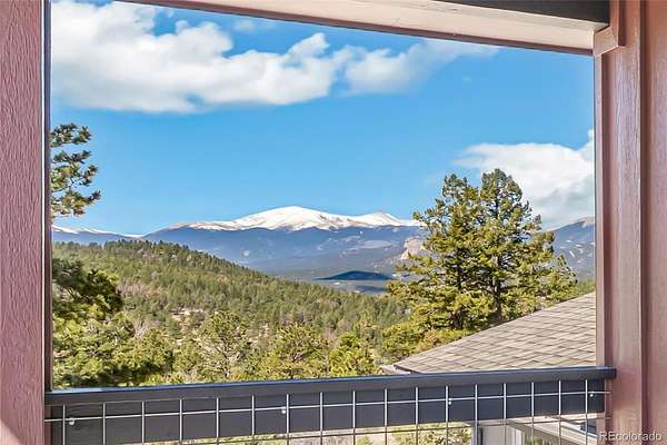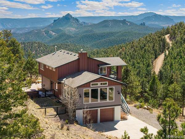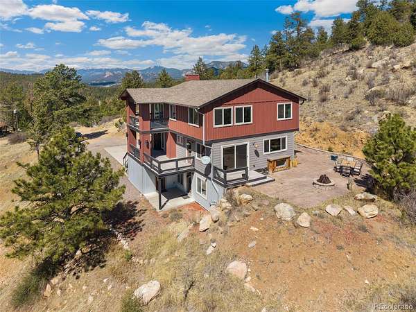 Perched on over 5 acres in the heart of Colorado's Rocky Mountains, this spectacular mountain contemporary home offers incredible views of snow-capped peaks, dramatic rock outcroppings, and pine-forested ridge lines. Completely reimagined and rebuilt in 2015, this 3,704 sq ft home blends modern luxury with mountain authenticity. Step inside to an open, light-filled floor plan anchored by a gorgeous great room with a two-sided gas fireplace featuring a stone facade. The gourmet chef's kitchen offers dark espresso cabinetry, solid surface countertops, stainless appliances including a gas range with hood, a large center island with pendant lighting, and warm hickory hardwood floors that flow throughout. The upper level is your private sanctuary. The expansive primary suite features a five-piece bath with soaking tub, a frameless glass walk-in shower, and a private covered balcony deck perfectly positioned to capture amazing mountain views. Two additional bedrooms and a bath round out the upper floor, along with a convenient laundry room. The finished walkout basement adds flexibility, with 2 more bedrooms, a full bath, and family room with an exterior ground level entrance door and a connecting garage access door. Outside, the living space is just as impressive. A stamped concrete patio with a custom gas fire pit and hot tub creates the ultimate outdoor entertaining area. Multiple decks offer front-row seats to the sweeping mountain panorama no matter the time of day. Additional highlights include an oversized two-car garage plus bonus shop space, a whole-home, auto-starting, natural gas powered generator, all new carpet throughout (March 2026), new interior main level paint (March 2026), newer exterior paint (2024). All this just minutes from Highway 285, Conifer shopping, restaurants, and easy access to Denver — the perfect blend of total mountain seclusion and everyday convenience. This is Colorado mountain living without compromise.