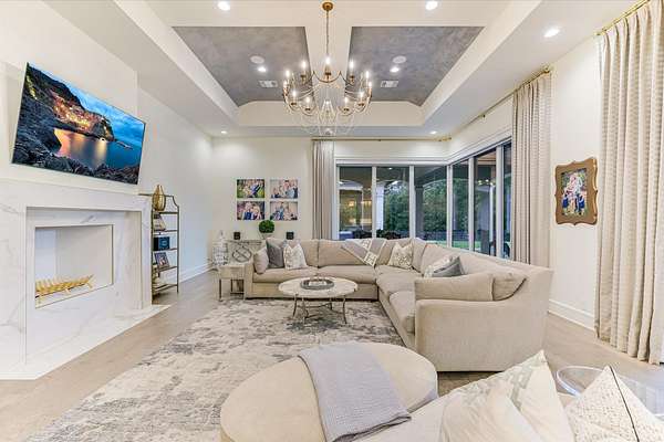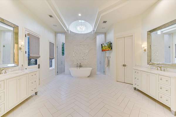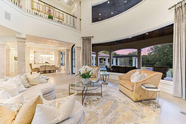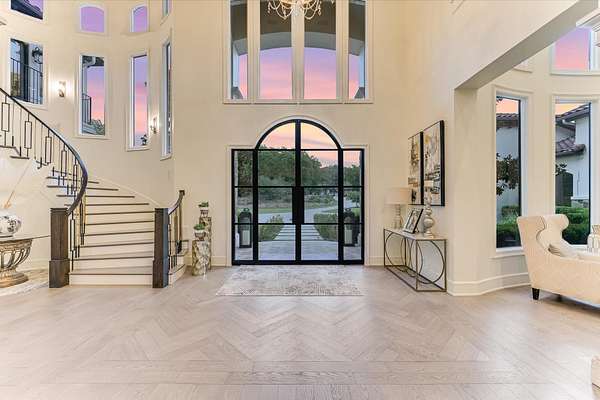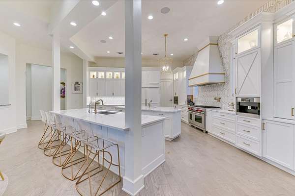 Enter through a grand foyer with soaring windows framing the lake and backyard views. Entertain with ease as the formal living and dining areas transition effortlessly into the kitchen, highlighted by a bar & wine cellar. The gourmet kitchen boasts top-of-the-line appliances, dual islands, & an open-concept living space.