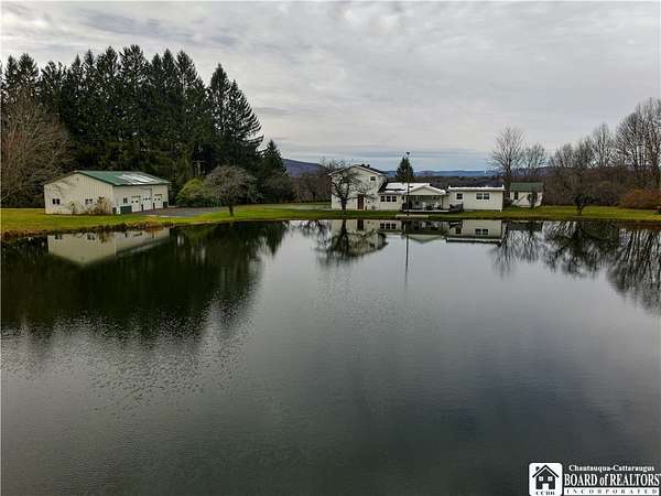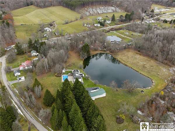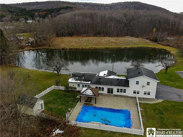 A rare opportunity in the Portville School District-privacy, acreage, luxury finishes, and unforgettable views all in one property. Welcome to 1414 Witherell Heights, a truly one-of-a-kind home perfectly situated between Olean and Portville, offering the ideal blend of convenience and seclusion. Inside, the main floor delivers exceptional comfort and function. The spacious living room features a natural gas fireplace and large windows that frame serene views of the property. The chef-friendly kitchen features beautiful quartz counters and has excellent dining areas, making everyday living and entertaining effortless. With two first-floor bedrooms, the layout is ideal for single-level living. The primary suite is a retreat of its own-complete with a huge walk-in closet, sitting area, and a spa-like bathroom featuring a tiled walk-in shower, heated floors, and a soaking tub. Another full bath on the first floor serves both guests and the additional main-level bedroom or potential first-level office. Upstairs, you'll find three more bedrooms and a third full bathroom, creating a perfect setup for family, guests, or hobby spaces. The property's outdoor amenities elevate this home to a new level. Enjoy spectacular views over the pond from the large covered deck, or take in breathtaking sunsets over the valley from the concrete patio surrounding the inground pool. Whether you love to entertain or unwind in nature, these outdoor spaces are unmatched. Car enthusiasts, hobbyists, or anyone needing extra space will appreciate the massive three-car garage, which is large enough to store a boat, along with an additional finished area ideal for a home office, gym, or creative workspace. With its acreage, privacy, modern upgrades, luxurious primary suite, and incredible indoor-outdoor living, 1414 Witherell Heights stands out as a premier property in the region. This home rarely becomes available and truly offers it all.