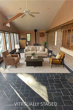 Nestled on 3.1 acres of park-like scenery, this mid-century home offers space, character, and endless potential. The showpiece of the property is the stunning 700 sq. ft. vaulted four-season room featuring slate floors, a wood-burning stove, and panoramic windows that bring the outdoors in year-round. Inside, you'll find six bedrooms, abundant storage, and generous living spaces designed for comfort and functionality. The home's sprawling lot includes a large garden, mature trees, and room to roam all while being conveniently located within city limits. Recent updates include central A/C and a refreshed main-floor bath. This first-time-on-the-market property presents an amazing opportunity to build equity and restore its original mid-century charm with your own vision and effort. Cash or conventional financing only. Property sold AS-IS.