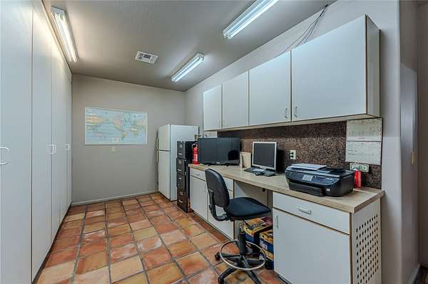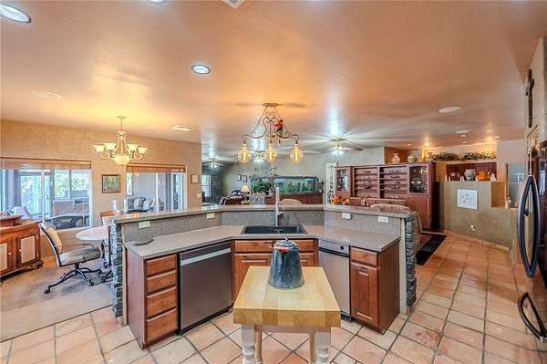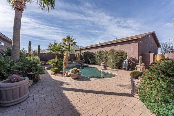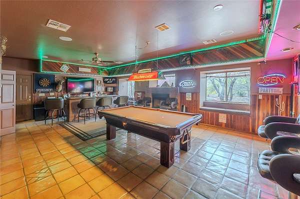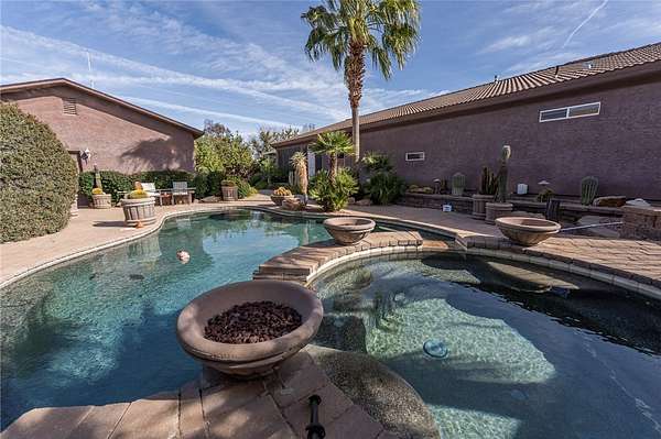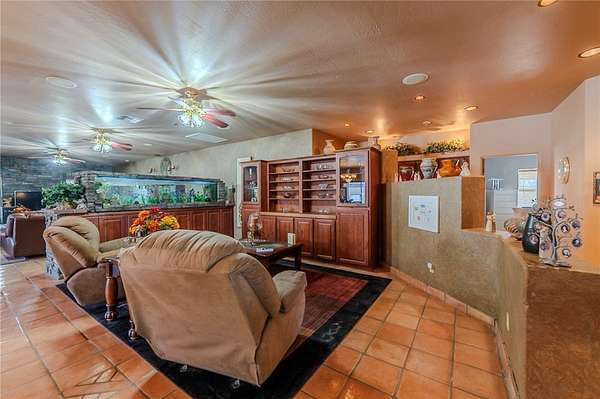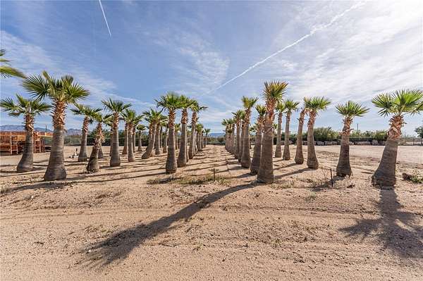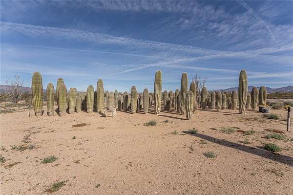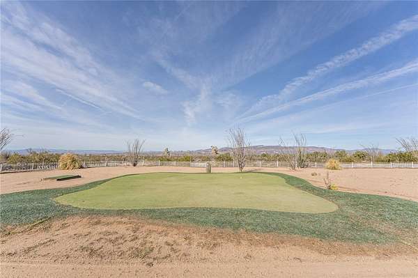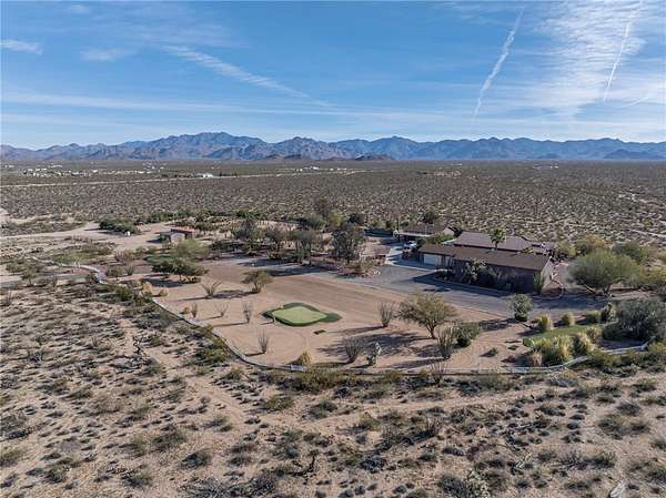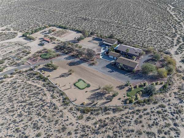 Experience elevated resort-style living in this custom-designed desert estate, where refined luxury meets breathtaking open space and unparalleled amenities. The 3-bedroom, 3-bath main residence is a showcase of architectural elegance and thoughtful design. A great room welcomes you with a striking natural stone fireplace and custom aquarium, creating a dramatic yet inviting focal point. A versatile flex space transitions effortlessly between an intimate sitting salon and formal dining room. The kitchen is sophisticated and functional, offering abundant cabinetry, stainless steel appliances, breakfast bar, and casual dining area designed for effortless entertaining. A well-appointed utility room features extensive built-in storage and a dedicated workspace. Designed for hosting on any scale, the recreation room boasts a full bar, window seating, pool table, and ample storage, an entertainer's dream for lively gatherings or private viewings of your favorite sporting events. The primary suite is a serene sanctuary, complete with two spacious walk-in closets, a cozy natural stone fireplace, private sitting area, and direct patio access. The primary bath indulges with a soaking tub, walk-in shower, and dual vanities. Seamlessly blending indoor and outdoor living, the sun room offers a tranquil retreat, while the observation deck provides a stunning vantage point for fiery desert sunsets and brilliant stargazing. Your private courtyard oasis awaits with a heated pool and spa, fire pit, expansive decking, mature fruit trees, and covered patio featuring a built-in BBQ and soothing water fountain, an idyllic setting for relaxation and entertaining alike. The 2,000+ sq. ft. guest house offers versatility with central heat and air, kitchen and dining areas, a full bath, bedroom loft, custom office, and central space with built-ins and storage perfect for multi-generational living, guests or game room. Automotive enthusiasts will appreciate the detached 3-car garage, covered parking, and 34 x 40 workshop. Two additional outbuildings and private 9-hole golf course elevate this estate. Gated with a scenic approach to the main house. The palm tree and barrel cactus farms offer income potential or landscaping projects around your 60-acre desert paradise. This desert sanctuary offers sophistication, recreation, privacy, and endless possibilities.