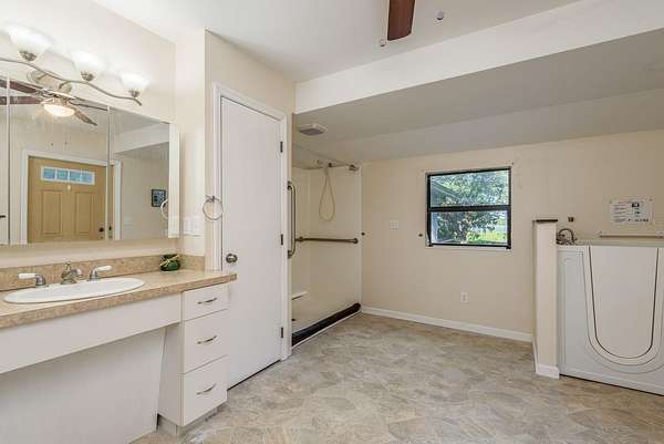 - Accessibility Features, Built-In Features, Cathedral Ceiling(s), Ceiling Fans(s), Eat-In Kitchen, L Dining, Primary Bedroom Main Floor, Split Bedroom, Stone Counters, Thermostat, Vaulted Ceiling(s), Walk-In Closet(s)