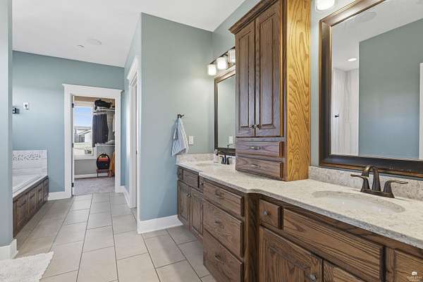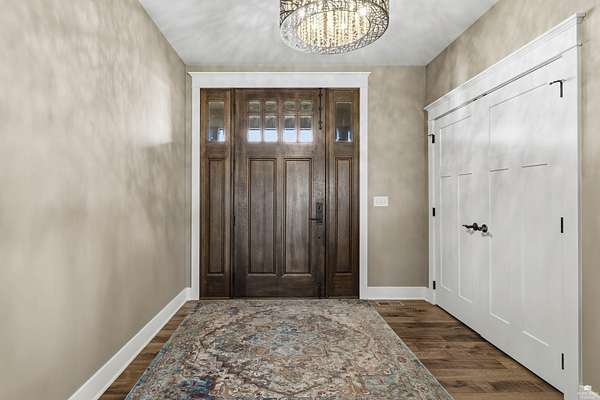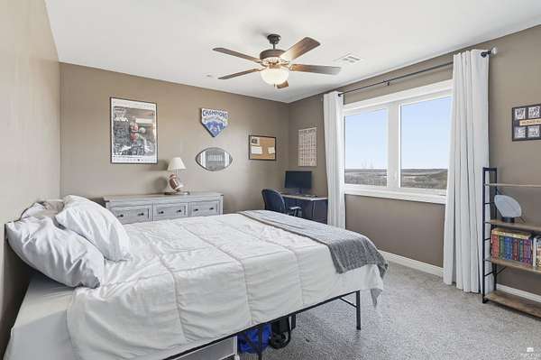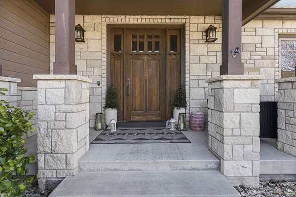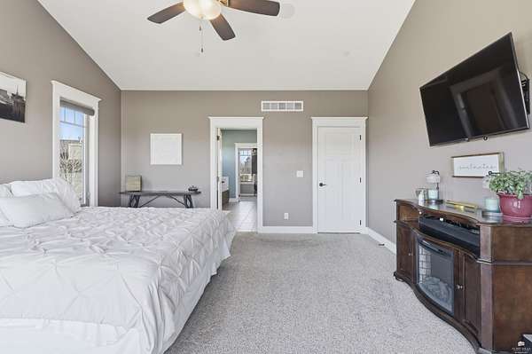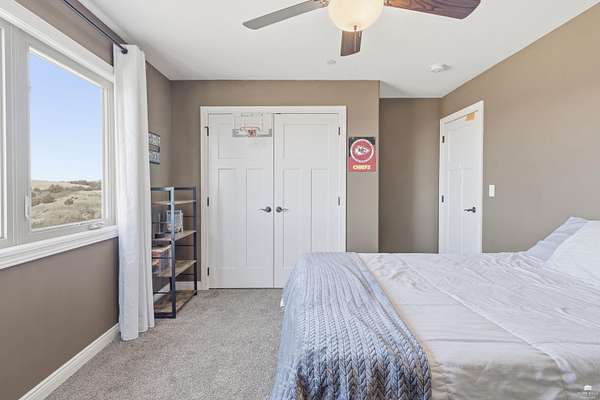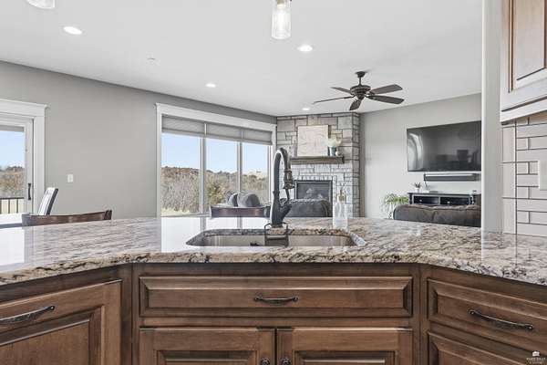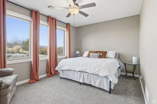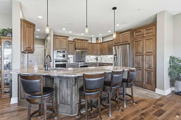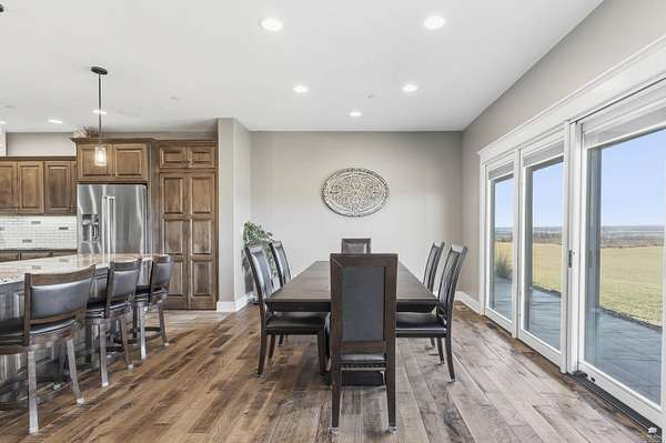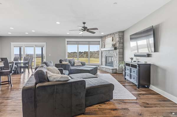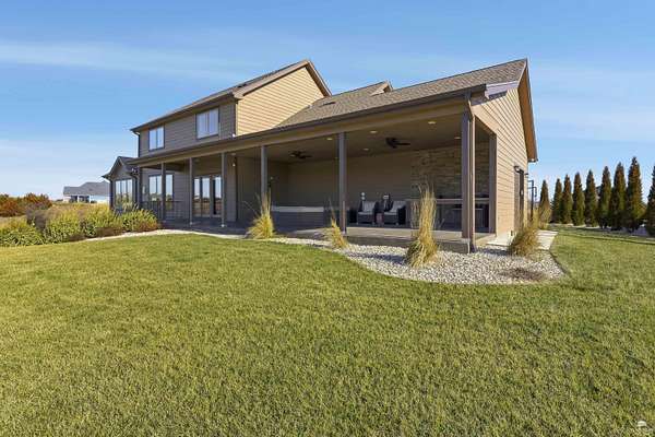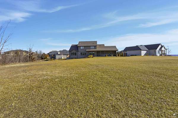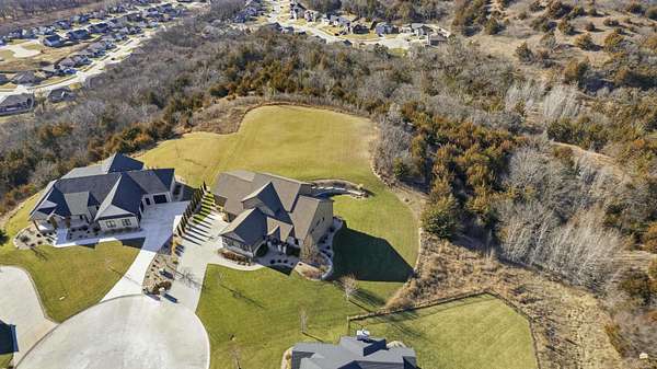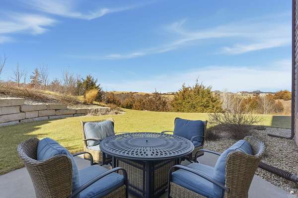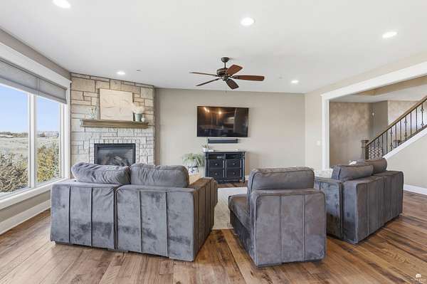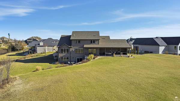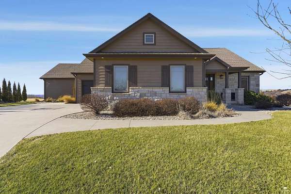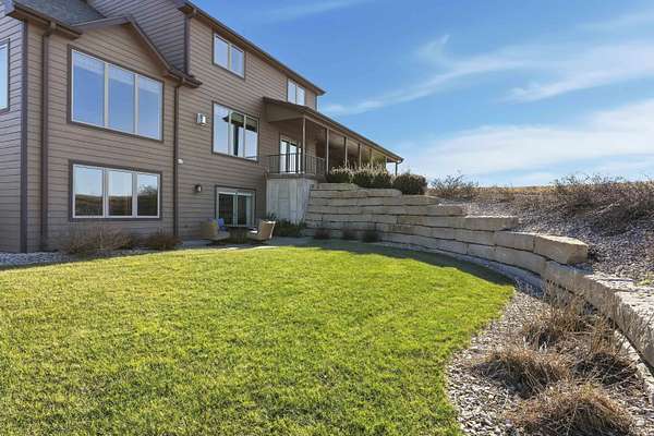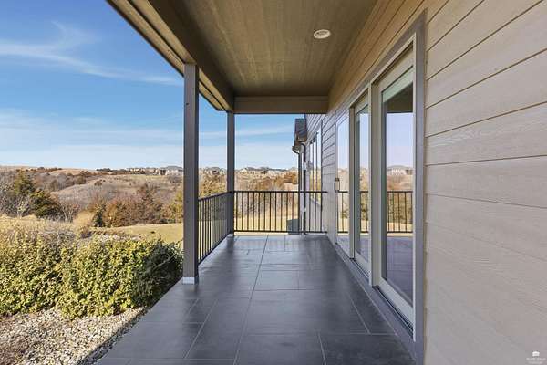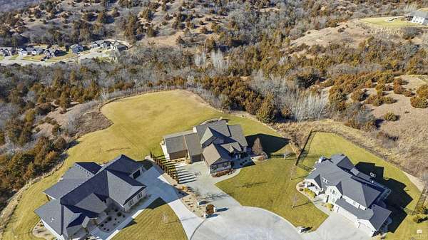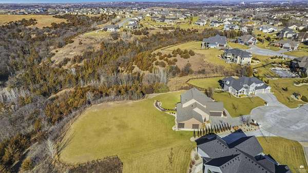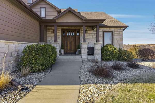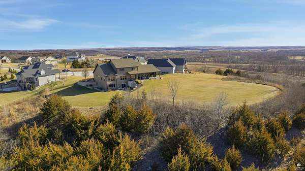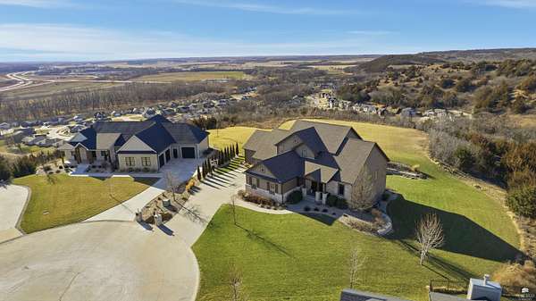Exclusive custom-built home on 5.98 acres in Grand Bluffs, located within Manhattan city limits and serving Marlatt and Anthony schools. Rustic hardwood floors lead from the open staircase foyer into the great room featuring a real stone gas fireplace and floor-to-ceiling windows with unobstructed valley views. The open-concept layout flows to an enormous covered patio with a grilling/cooking area, manicured yard, additional native acreage and amazing sunset views. The kitchen offers walnut soft-close Custom Woods cabinetry, a hidden large pantry and granite countertops. The main-level primary suite boasts vaulted ceilings, stunning views, a walk-in dual-head tiled shower, jetted tub and oversized walk-in closet. The second floor features 3 bedrooms with a generous gathering area. The lower level includes two more bedrooms, plus a media and recreation room. Additional features include interior/exterior sprinklers, Sonos sound system, ample storage, a safe room and a three-car garage.