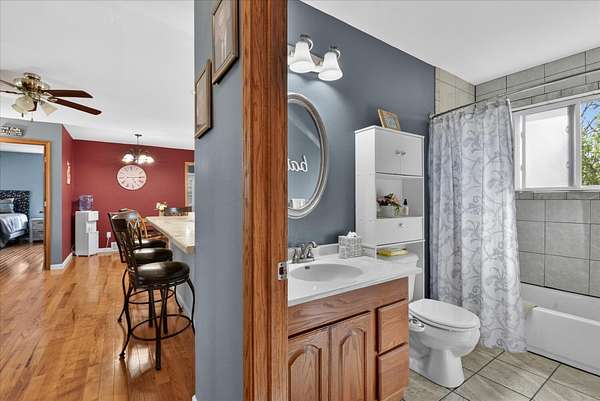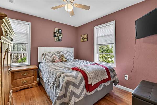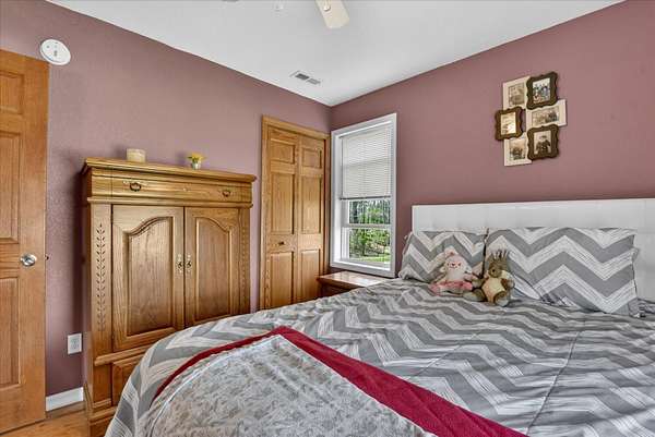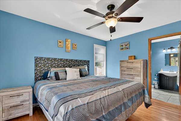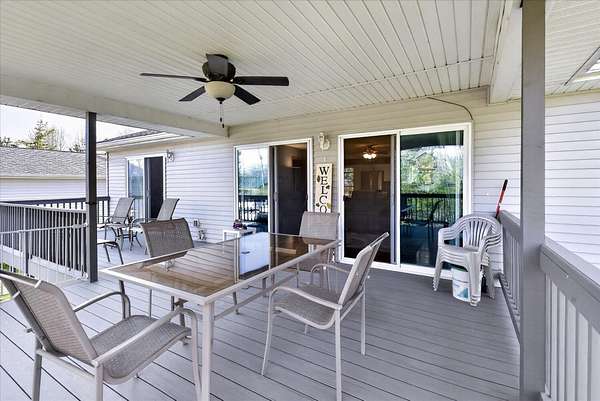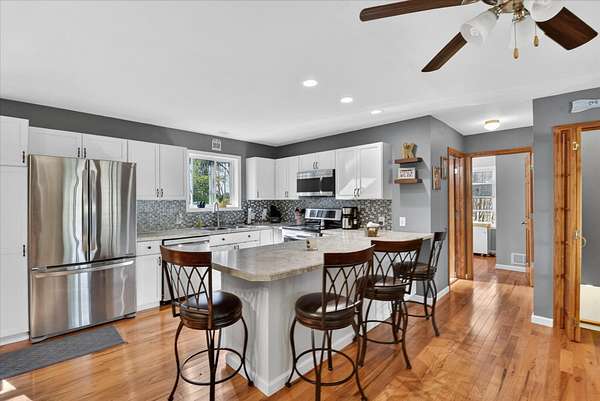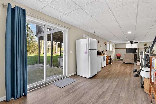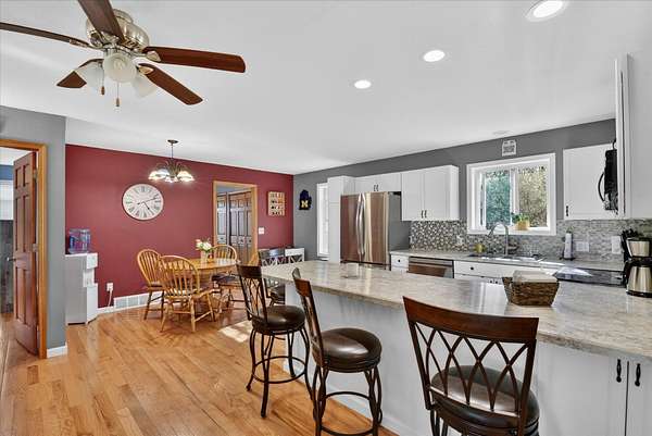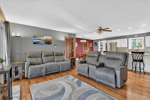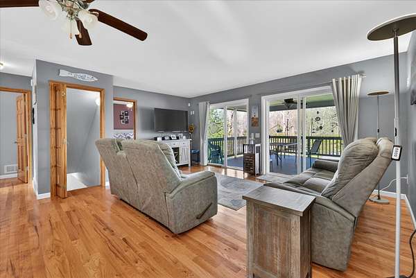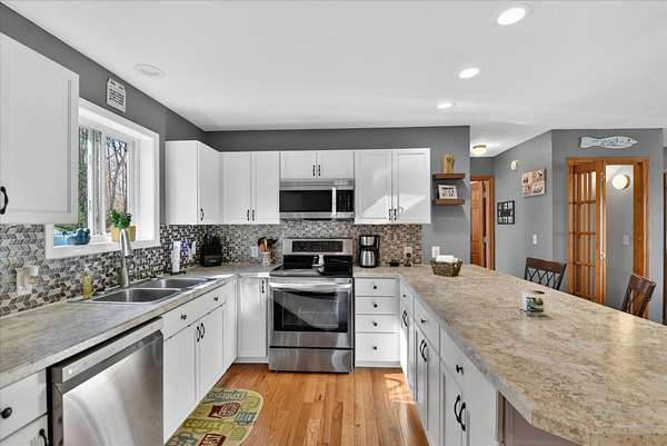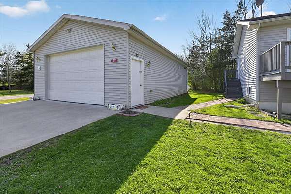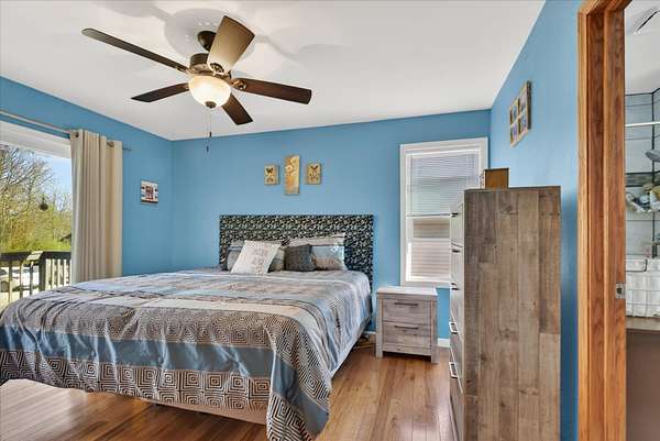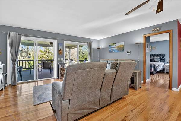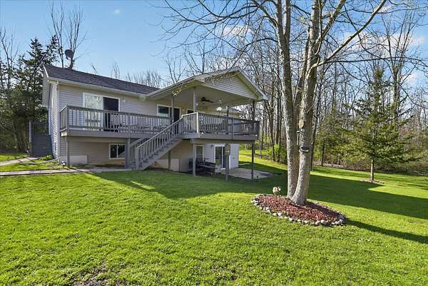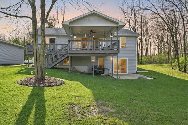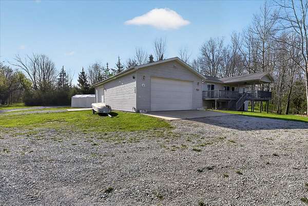 This four-bedroom, three-bathroom home blends indoor comfort and outdoor fun. With 2,464 square feet of living space, it promises plenty of room to share and entertain. Inside, the living area offers an open floor plan and beautiful lake views, perfect for entertaining or family evenings. The modern kitchen delights with stainless appliances and ample storage. The dining area flows seamlessly, ideal for both casual meals and formal gatherings. Four bedrooms ensure comfort and privacy for everyone. The primary suite is spacious with an en-suite bathroom, with walk-in shower. The finished walk-out basement is perfect for a family room, game room, or home gym, opening directly to the backyard for easy lake access. With 310 feet of private all sports lake frontage, enjoy swimming, fishing, or boating. The expansive deck is perfect for barbecues, and the yard offers space for play. A detached pole barn/garage provides ample space for vehicles and lake toys, while an outbuilding offers lakeside storage. This lakefront home is more than a place to live--it's a lifestyle. Make this lake home your reality.