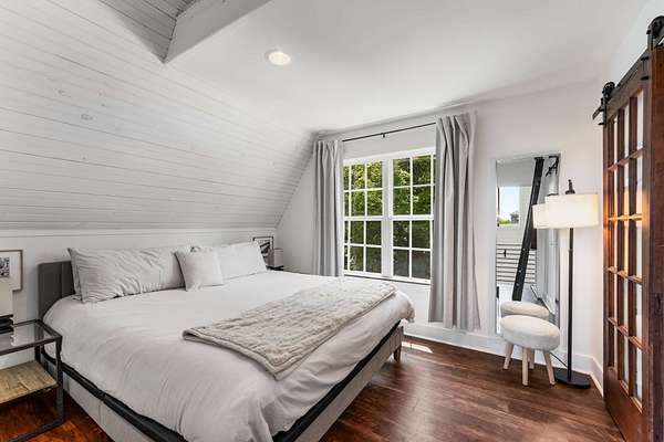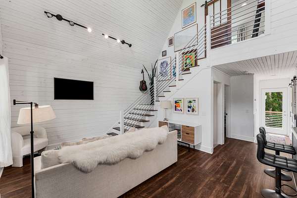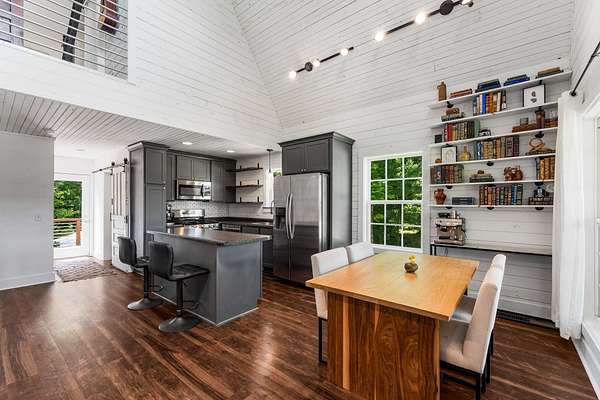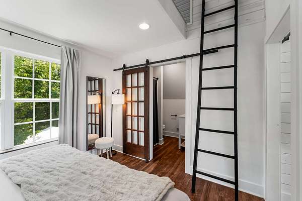 The open-concept main level features a stylish kitchen with a gas range, stainless steel appliances, bar seating, and access to a covered porch--ideal for entertaining, grilling, and unwinding in nature. Upstairs, the spacious primary suite offers treetop views, a private bath, and a ladder-access loft perfect for storage, reading, or creative escape. The walk-out basement adds incredible flexibility with a finished space ready to serve as a bedroom with its own private entrance, a gym, a home office, or a guest suite.