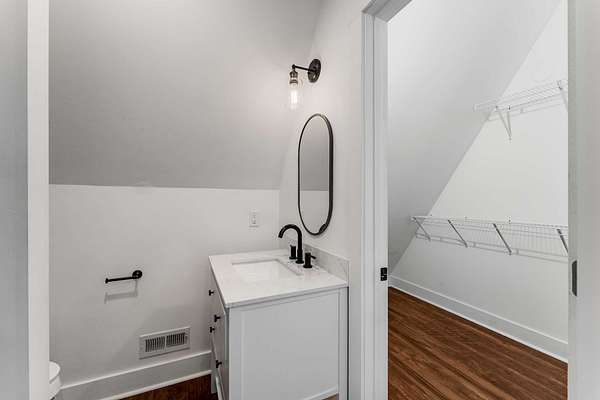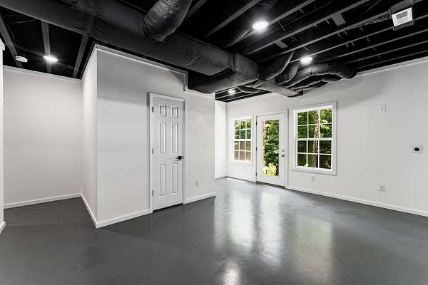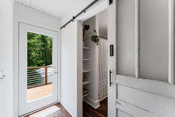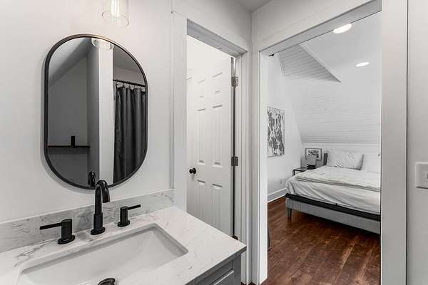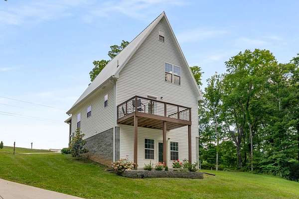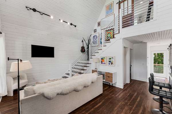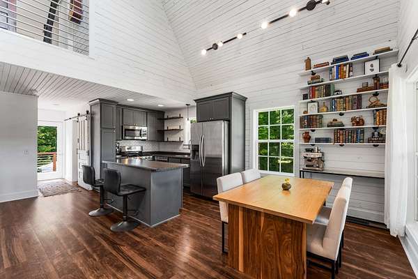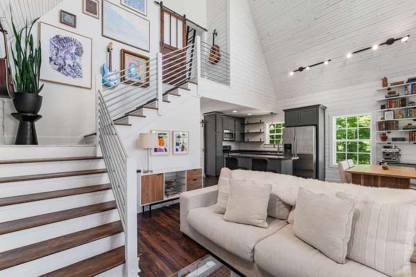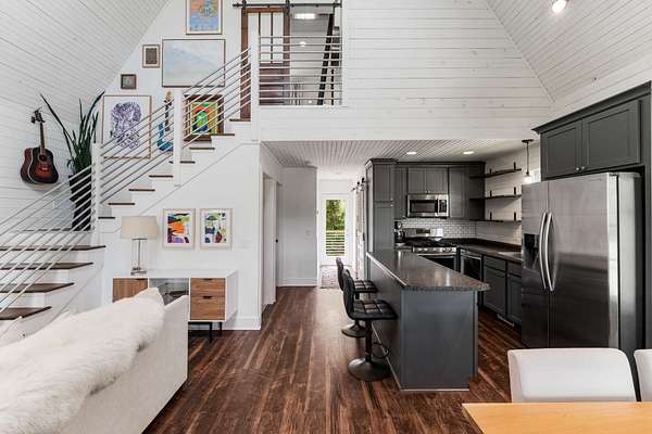 The open-concept main level features a stylish kitchen with a gas range, stainless steel appliances, bar seating, and access to a covered porch—ideal for entertaining, grilling, and unwinding in nature. Upstairs, the spacious primary suite offers treetop views, a private bath, and a ladder-access loft perfect for storage, reading, or creative escape. The walk-out basement adds incredible flexibility with a finished space ready to serve as a bedroom with its own private entrance, a gym, a home office, or a guest suite.