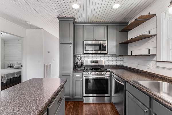 - Dishwasher, Gas Range, Oven, Refrigerator, Stainless Steel Appliance(s)