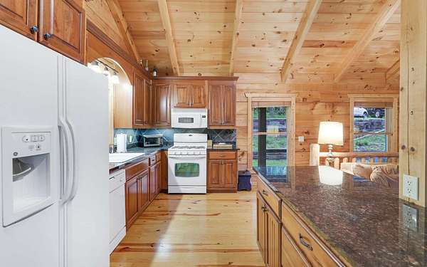 Experience the ultimate mountain retreat or full time home at a refreshing 3,000-foot elevation in the picturesque "Valley Above the Clouds". This beautifully crafted log cabin features 3 bedrooms and 2 baths, designed with an open floor plan that blends rustic charm with modern comfort. The main level boasts rich yellow pine floors, while the terrace level showcases elegant stone flooring. The great room is a showstopper, with vaulted wood ceilings, exposed beams, and a striking stone masonry fireplace...perfect for cozy mountain evenings. Granite countertops in the kitchen and bathrooms add a touch of sophistication to the cabin's warm, rustic aesthetic. The master bedroom and living area open onto a spacious porch, ideal for entertaining or simply relaxing while soaking in the crisp mountain air and mountain views! Downstairs, the terrace level offers two additional bedrooms, a bathroom, and a versatile rec room with a wet bar. Practical features include a concrete safe with a steel door, a utility room with a washer and dryer, and a full-house propane generator for uninterrupted comfort. A paved, private, gated driveway ensures both privacy and security. With a bit of tree trimming, the property has the potential for breathtaking long-range views. Shared well and additional property available adjoining the National Forest. Outdoor enthusiasts will love the location--just a short walk to the National Forest and only five minutes from Lake Winfield Scott and the Appalachian Trail, offering endless opportunities for hiking, fishing, and exploring. Whether you're seeking a full-time residence or a peaceful mountain getaway, this exceptional property offers the perfect blend of seclusion, comfort, and adventure. Adjoining acreage properties are MLS#412811 (4.83 acres) and MLS#412813 (7.34 acres)
