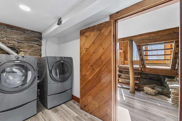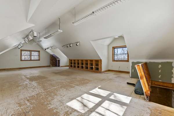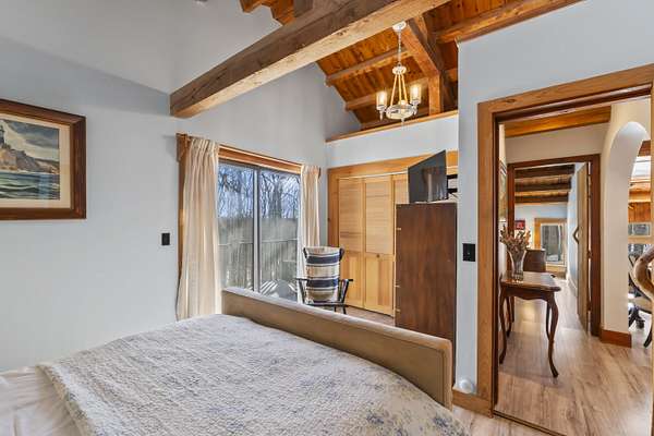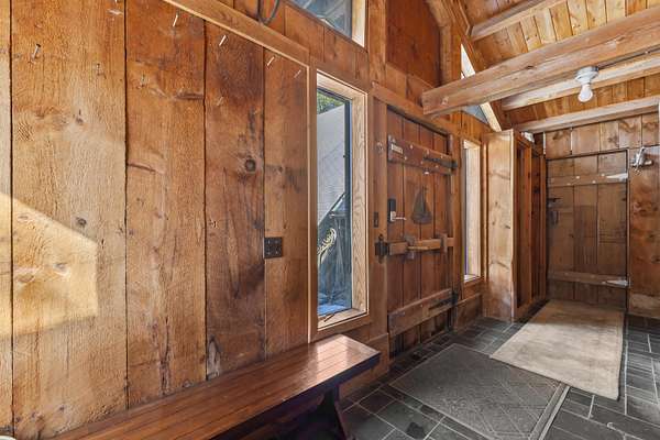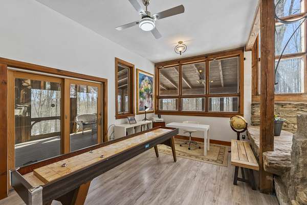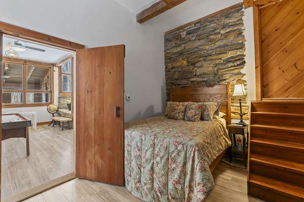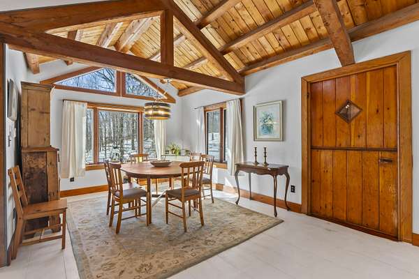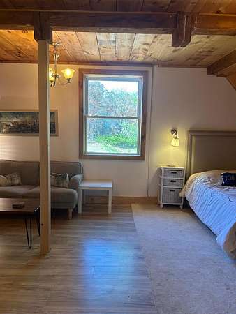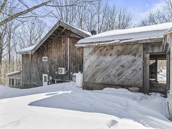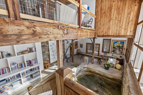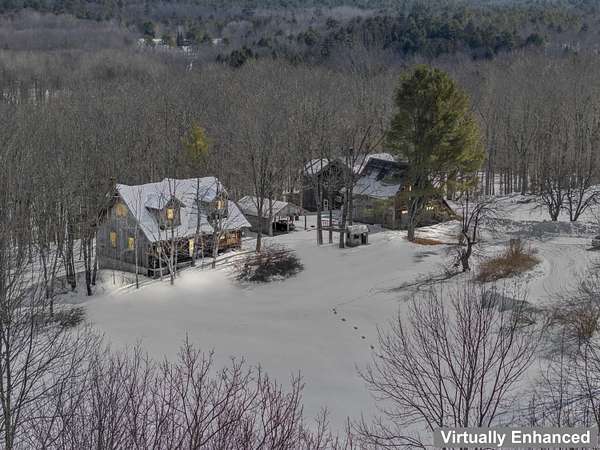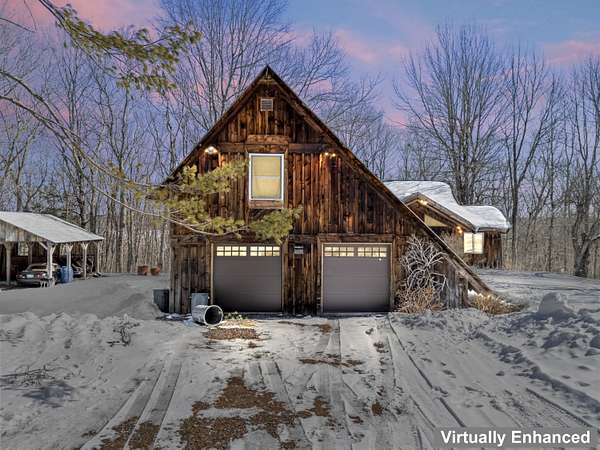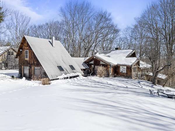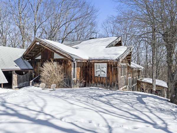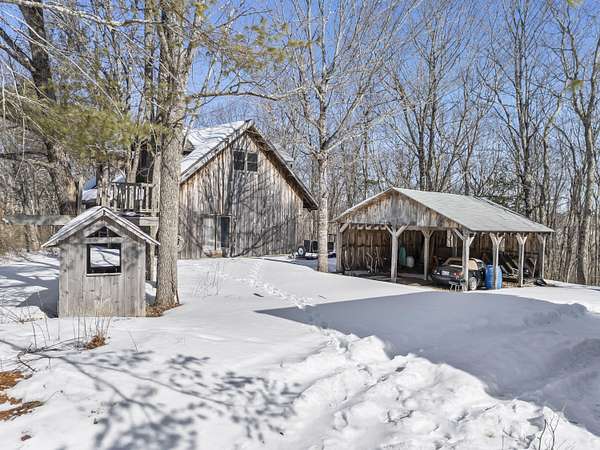 Extraordinary property featuring a 1977 post-and-beam contemporary home with a striking interior water feature and a dramatic wall of windows that brings the beauty of nature indoors. This very private 3-bedroom, 2-bath home offers an open-concept layout centered around a stunning granite fireplace. Cathedral ceilings and exposed beams create a warm yet dramatic living space anchored by an impressive stone chimney. Enjoy entertaining, reading, or simply relaxing on the spacious wrap-around screened porch overlooking a moss-covered, fern-filled forest and outdoor waterfall. The attached garage includes an apartment above--ideal for guests, in-laws, or potential rental income. The massive detached two-story barn is heated and offers endless possibilities--perfect for a workshop, artist's studio, or even conversion into a second living space. Set on a private 5-acre estate, this property offers the serenity of nature while remaining conveniently located just 7 miles from Topsham, 9 miles from Brunswick, and approximately 30 minutes from both Portland and Augusta. Surrounded by abundant wildlife and peaceful woodland views, this remarkable home is a true retreat--ready to become your everyday oasis.