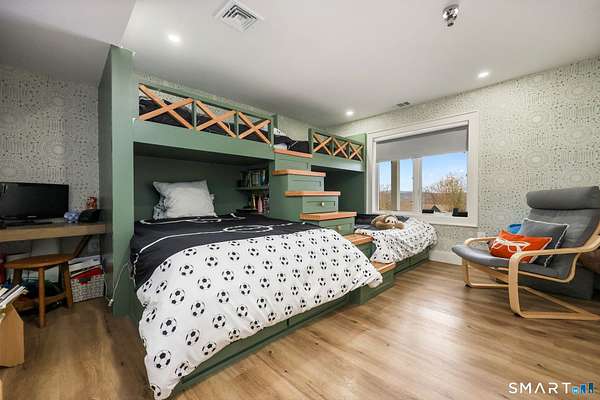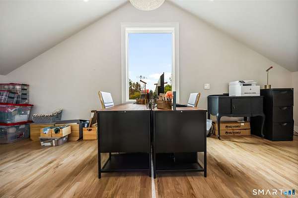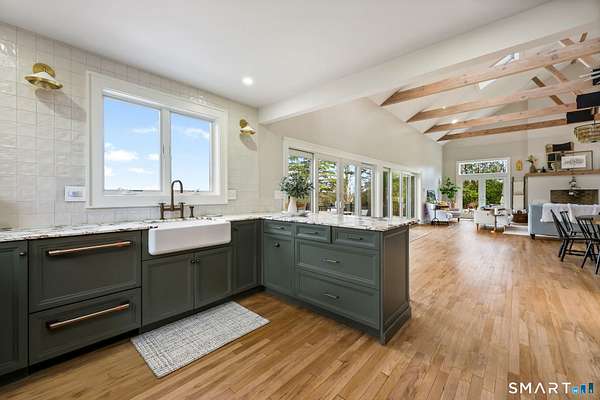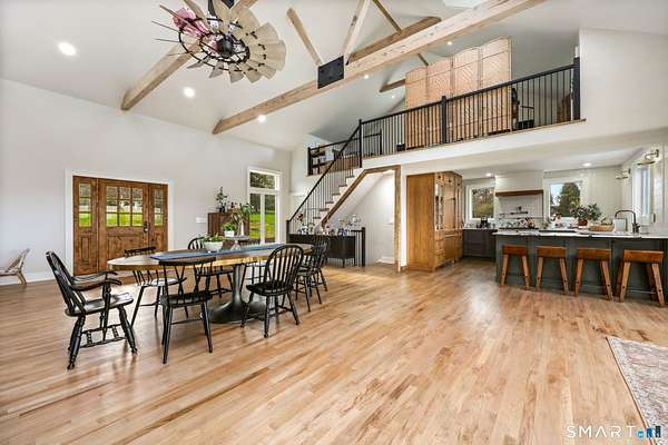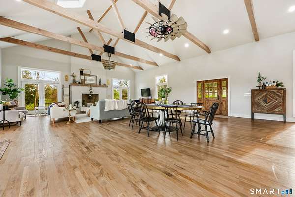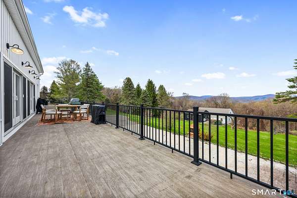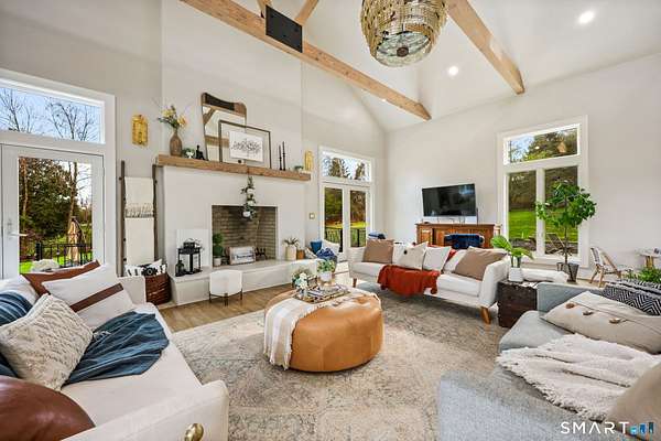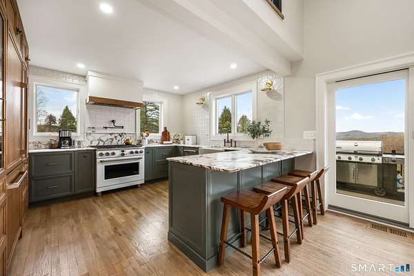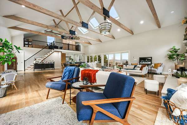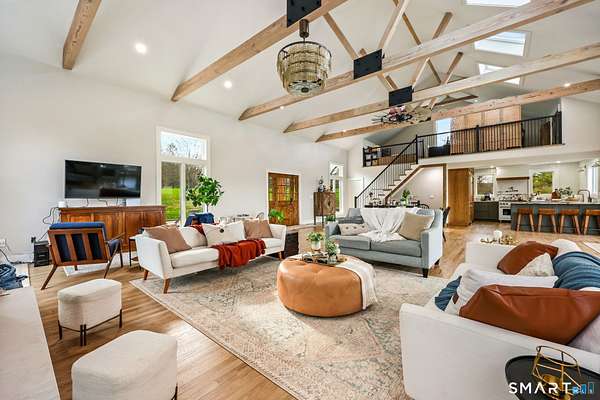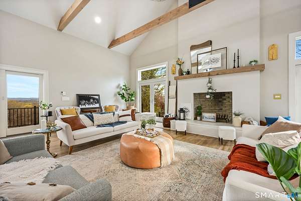 Set on an extraordinary 12.81-acre parcel, this one-of-a-kind estate offers a rare blend of privacy, luxury, and architectural distinction. Fully renovated from top to bottom, the home showcases exceptional craftsmanship with high-end, custom finishes and a design unlike anything you've seen before. Step inside to the main level where soaring ceilings, exposed beams, and walls of glass fill the great room with natural light, anchored by a striking fireplace. The stunning custom kitchen is both functional and beautiful, seamlessly connecting to the dining area-perfect for everyday living or entertaining. A unique lofted office space overlooks the main living area, adding character and versatility. The main level also features a thoughtfully designed full bathroom complete with a built-in sauna for a spa-like experience. The lower level offers a private retreat with a spectacular primary suite featuring a luxurious full bath, walk-in shower, and custom closet. A second bedroom includes charming built-in bunk beds, while the mudroom/laundry room is equipped with custom built-ins and a convenient bench. Step outside and enjoy resort-style living with direct access to an in-ground pool and spa, as well as an expansive deck ideal for entertaining or relaxing while taking in breathtaking long-distance views.