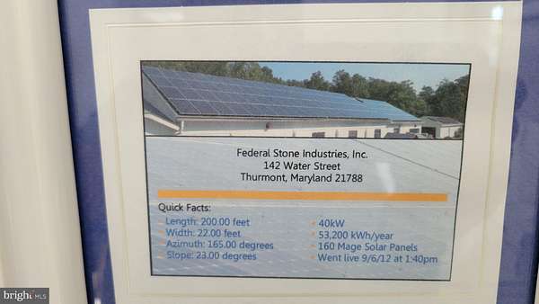 Light manufacturing/warehouse building with outside storage on 3.8 acres with General Business zoning, The Property includes 8,400 SF of space in two contiguous buildings. The main building features 1,340 SF +/- of fully conditioned office space and 5,360 SF +/- of production/warehouse space, served by three drive-in doors and radiant floor heat. Ceiling heights range from 11' to 19' clear. The second building contains 1,690 SF production/warehouse space with 11' clear ceiling height and a ceiling-mounted radiant strip heat. The property is served by a 600 amp three-phase electric service, a 40 kW solar system, and public water & sewer. Conveying with the property are 4 storage sheds totaling 1,760 SF +/-. Zoning is GB (General Business), which allows a wide variety of commercial uses including (but not limited to): Business Services/Plumbing Shops/Contractor Shops; Professional and Businiess Offices; Wholesaling/Warehousing; Micro-brewery/Micro-distillery; Restaurants; Auto Body Shop; Auto Sales; Retail Nurseries; Lumber Yard; Small Scale Manufacturing etc. The Property is currently occupied by a light manufacturer as a legal non-conforming use; Thurmont officials have indicated that the property may be used for manufacturing (continuance of the current non-conforming use) provided that the new use is not more intensive than the current use. Any proposed non-conforming use can be reviewed by the Town Manager for binding decision quickly; Thurmont is a business- friendly location!