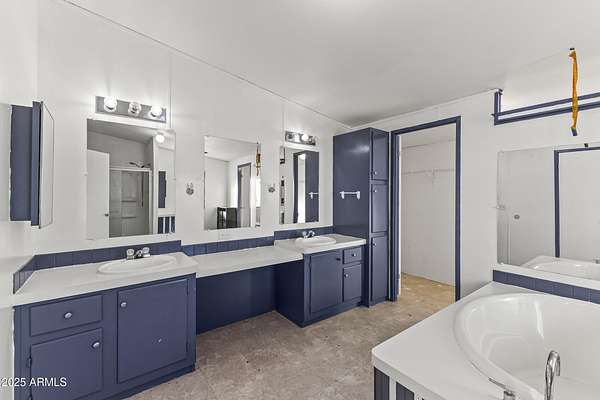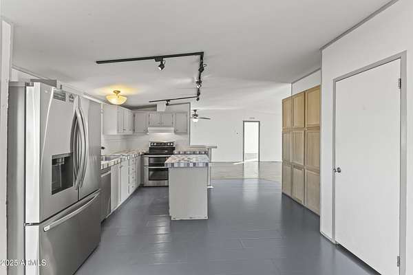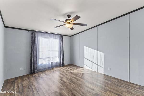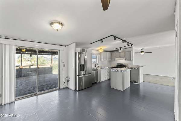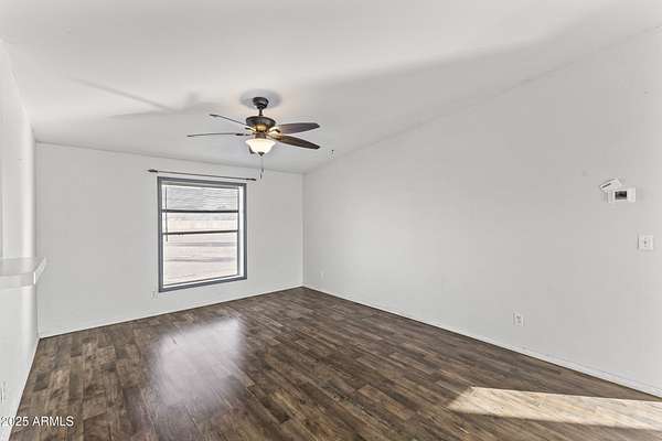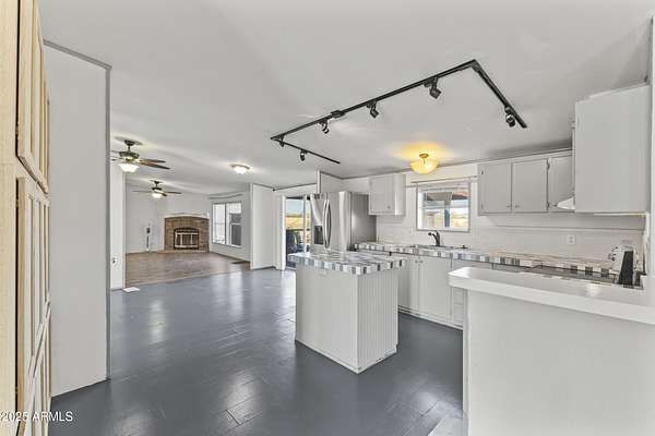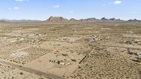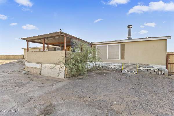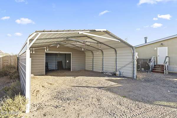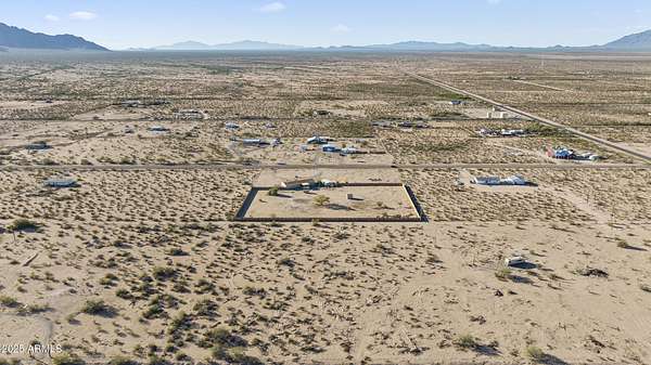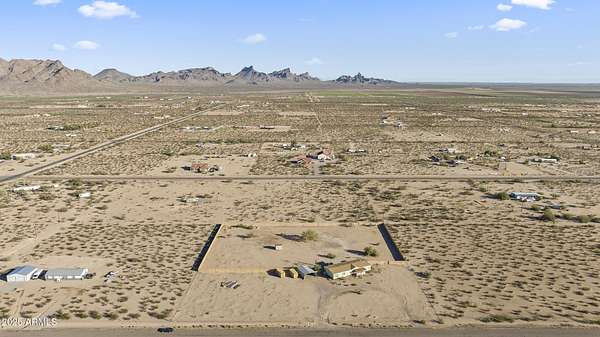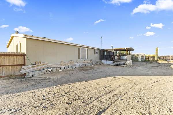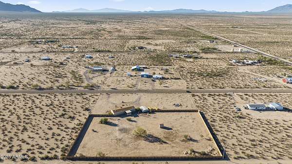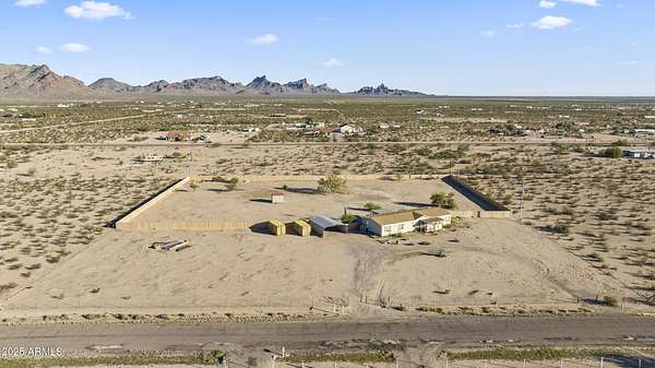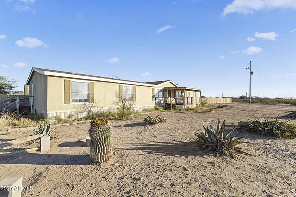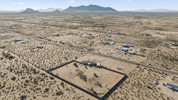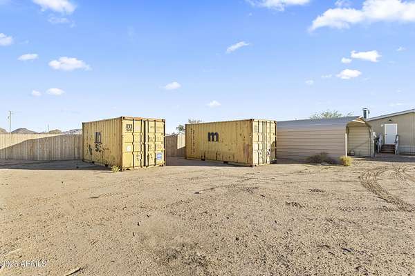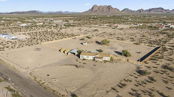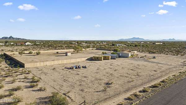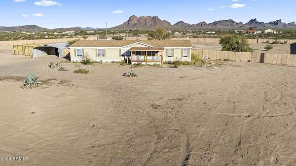 Experience wide-open desert living with room to roam! This home sits on 3.4 acres of beautiful Arizona land, offering peace, privacy, and mountain views. Featuring a spacious open-concept layout with a comfortable living area, split-bedroom floor plan, and plenty of natural light. The large kitchen includes ample cabinet space and a breakfast bar perfect for gatherings. Outside you'll find a covered patio, Live wire fenced yard, and space for RV parking , toys, or even horses. There is a steel structure to park 2 other vehicles. This property includes 2 huge air/watertight containers for storage or keeping your toys in. There also is a kit (have to assemble) for a 43'x17' toy hauler structure the seller is leaving for the new homeowner. No HOA! Enjoy quiet country living close to the I-1