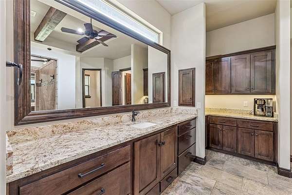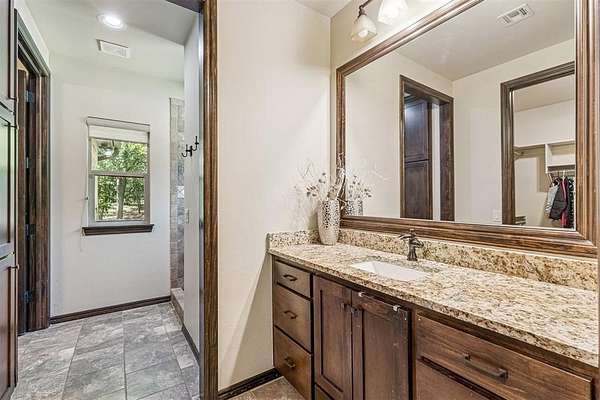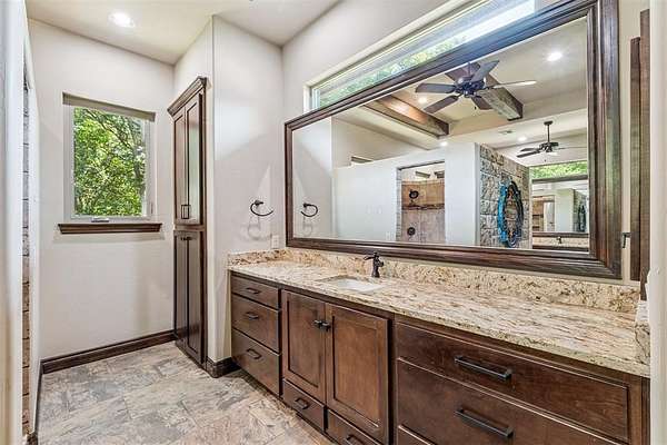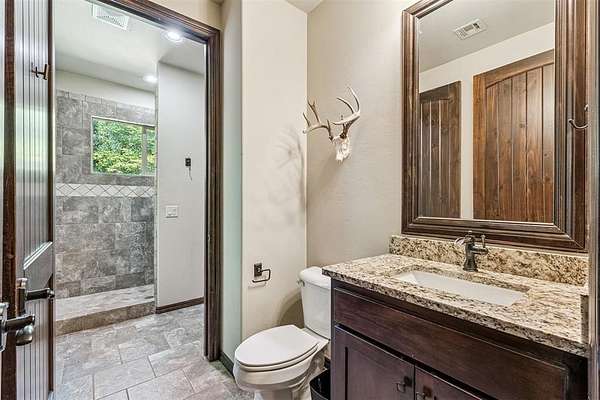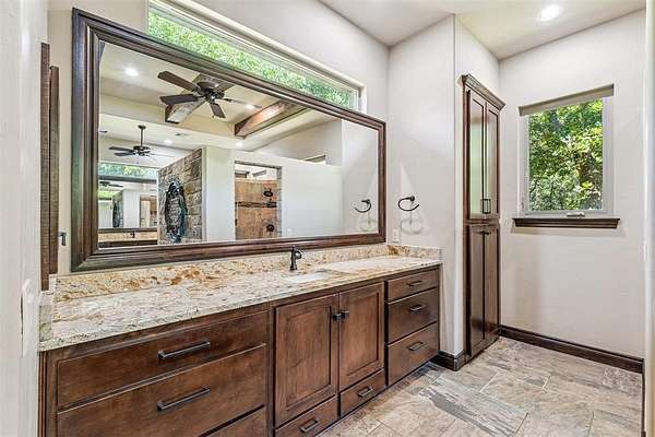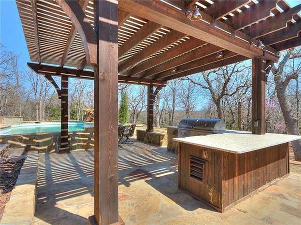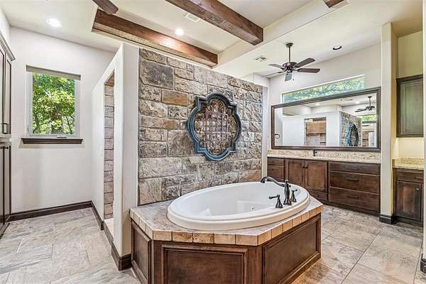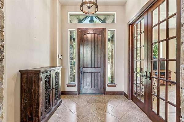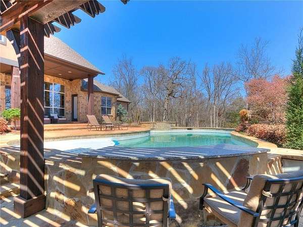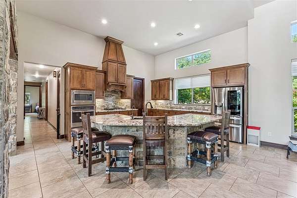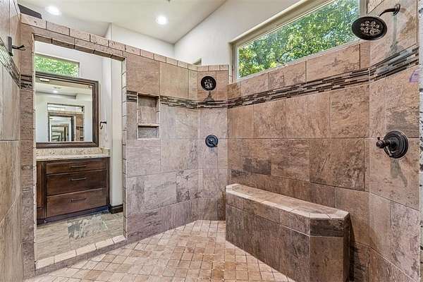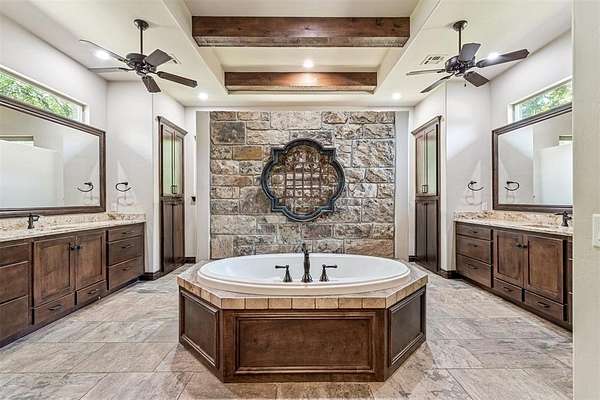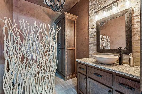 Step outside to your private backyard oasis featuring a heated pool with a rock waterfall, hot tub, outdoor kitchen, and dedicated pool half-bath. Additional features include a whole-house generator, garage storm shelter, tankless hot water heater, and water softener system.