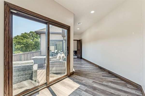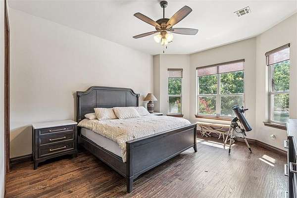 The primary suite features rich wood floors, private outdoor access, a spa-like en-suite with a jetted tub, walk-through shower, double vanity, and a spacious walk-in closet with custom built-in dressers.