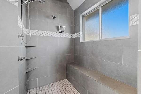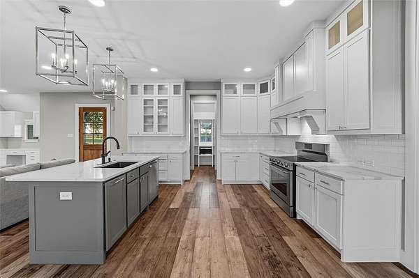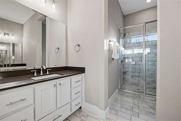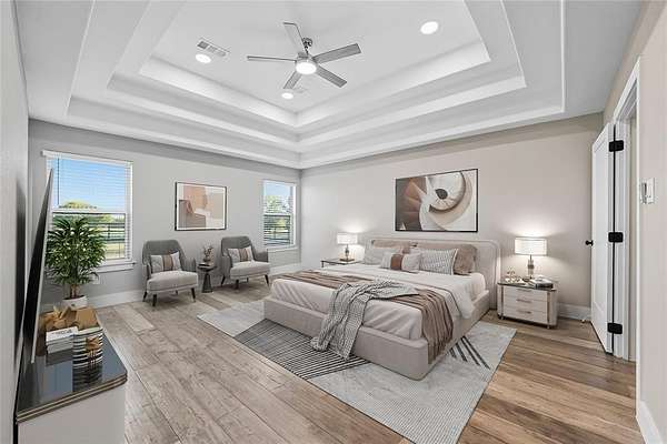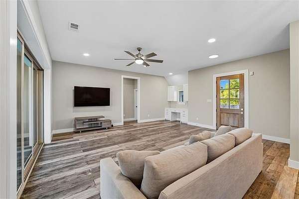 The thoughtfully designed floor plan offers 3 bedrooms and 2 bathrooms, including a private primary suite with a spa-inspired bath, double vanity, oversized walk-in shower, and a custom closet connecting directly to the laundry room. A chef's kitchen anchors the home with quartz countertops, floor-to-ceiling cabinetry, high-end appliances, a massive pantry, and a statement island for gathering. The open living and dining area is bathed in natural light, highlighted by a dramatic glass wall leading to the covered back porch.