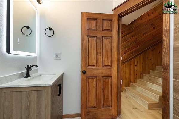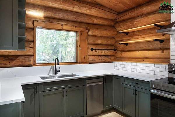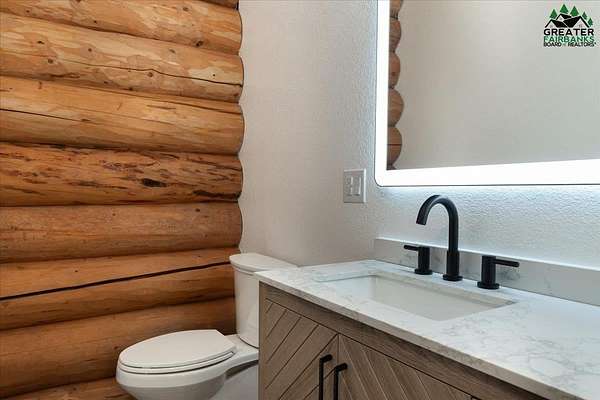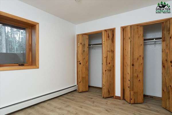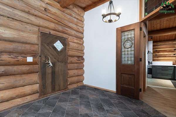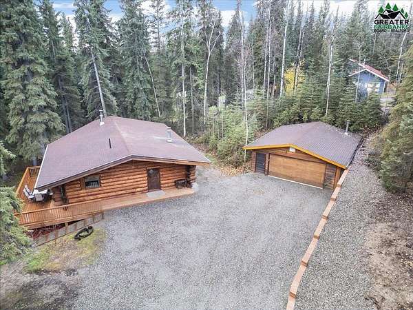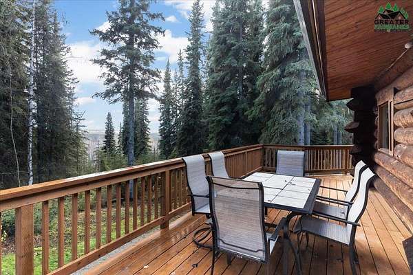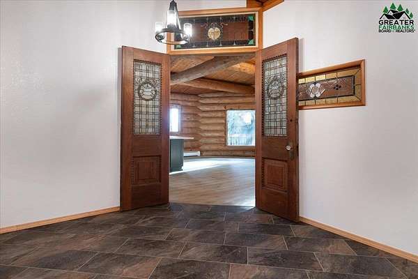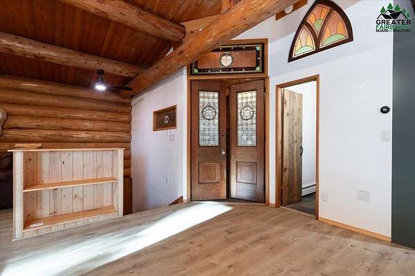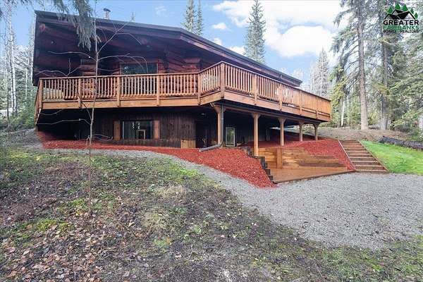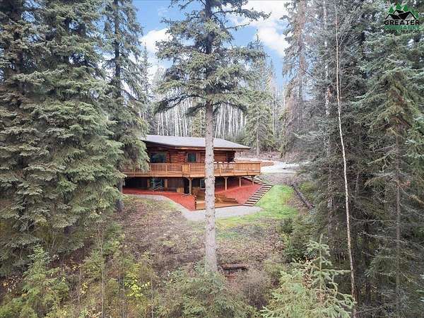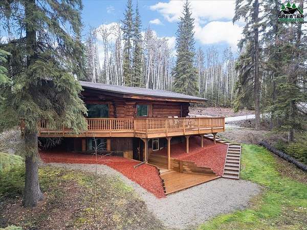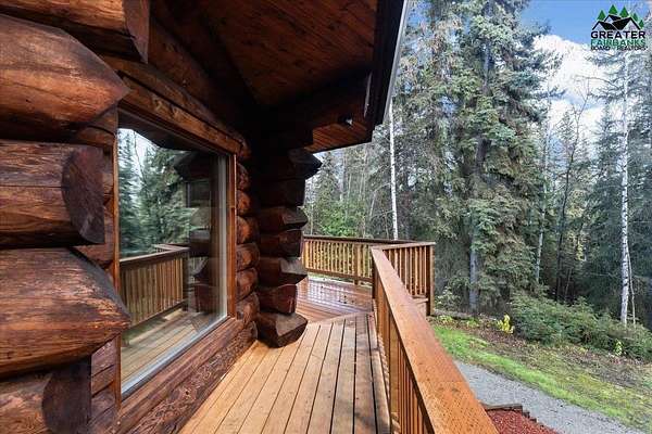 This Alaska Range view property is a gem hidden in the wooded hills of the highly sought-after University Heights neighborhood, this one-of-a-kind natural log home is a true Fairbanks treasure, built by renowned local artist Sandy Jamison. Set on a spacious, tree-lined lot above the inversion table, the home captures the timeless beauty of handcrafted Alaskan architecture with warm wood tones, soaring ceilings, and a wraparound deck that brings the outdoors in. Inside, you'll find artistic details everywhere you look, from custom stained glass windows that dance with sunlight, to a charming woodstove and open-beam design that create an inviting, rustic feel. The wood flooring and natural textures throughout the home give it an earthy elegance, while a large family room offers plenty of space to gather and unwind. Whether you're relaxing on the deck beneath the midnight sun or watching the aurora shimmer through the spruce, this property feels like a true work of art with a fitting view. Perfect for those who appreciate craftsmanship, privacy, and the authentic character of Alaskan living. Third bedroom does not have a closet.