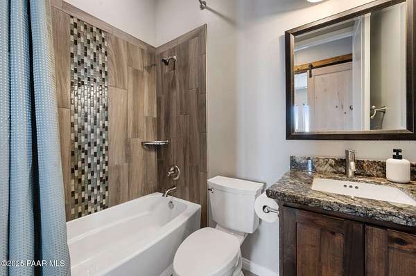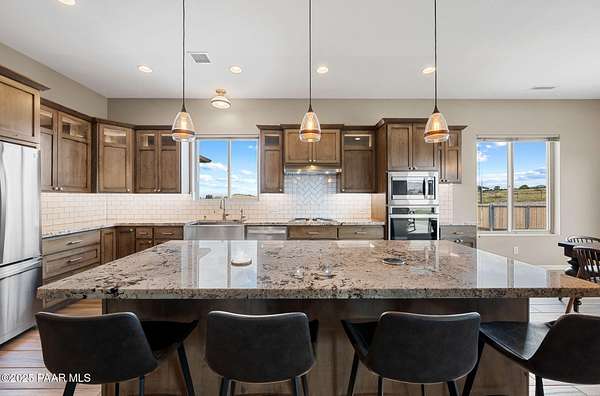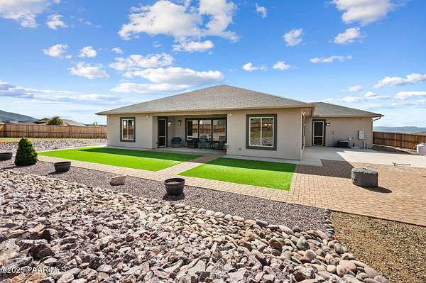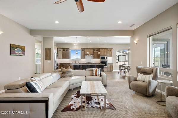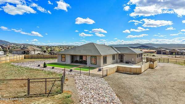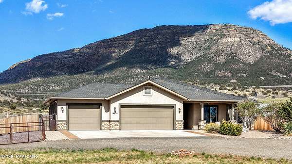 This beautiful home sits on over two level acres in the desirable Legend Hills community, offering panoramic mountain views, colorful sunsets, and year-round privacy. Backing directly to State and National Forest land, adventure begins right in your own backyard. An attached 3-car garage and a large detached 3-bay shop (1,027 sq. ft.) provide a total of six garage spaces. The shop is wired for 220-amp service and includes a full-length covered carport--perfect for vehicles, tools, or recreational equipment.Designed for both comfort and function, this home is an entertainer's dream. The open-concept chef's kitchen features rich wood cabinetry, granite countertops, stainless steel appliances, bar seating, and abundant storage, flowing seamlessly into a spacious living room with a cozy gas fireplace and sweeping views. The range is plumbed for gas, making it ideal for those who love to cook. A walk-in pantry and well-appointed laundry room with extra storage add to the thoughtful layout.The primary suite is a true retreat, showcasing mountain views, an electric fireplace, and direct patio access. The spa-inspired bath offers dual vanities, a walk-in shower, soaking tub, and an oversized closet. Guests will appreciate their own private suite with patio access, while the third bedroom makes an ideal office or flex space.Outdoor living shines with spacious patios at both the front and back of the home--perfect for relaxing or entertaining year-round. The backyard is low-maintenance with artificial turf and a gated pet area. Car enthusiasts and hobbyists will love the oversized attached 3-car garage, plus the detached 1,027 sq. ft. shop with 220-amp service, a full-length carport, two 50-amp RV panels, and an RV dump.Located minutes from the Iron King and Peavine Trails, the Granite Dells, and the sparkling waters of Watson and Lynx Lakes, this home combines quiet country living with convenience. Downtown Prescott is just a short drive away for boutique shopping, local dining, and year-round courthouse events. Explore Jerome's historic charm or spend the day in Sedona surrounded by breathtaking red-rock scenery--all within easy reach.Fully fenced, generator-ready, and ideal for pets or small animals, this property offers a rare combination of space, privacy, and functionality. Experience the perfect balance of adventure and comfort in this exceptional Prescott retreat.