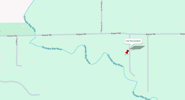 Thunder Bay River Frontage! 9.4 acres with approximately 180 ft of frontage. There is natural gas and electric on Airport Rd. There is an existing two track drive from the road to the river. The front 1/3 of the property is high and dry. The property rises again by the back of the property. It appears the center and westerly side of the property could hold water during the spring thaw and heavy rains. As of now it is dry and a bedding area for deer. I kicked up 5 deer when walking the property. Great price for river frontage.