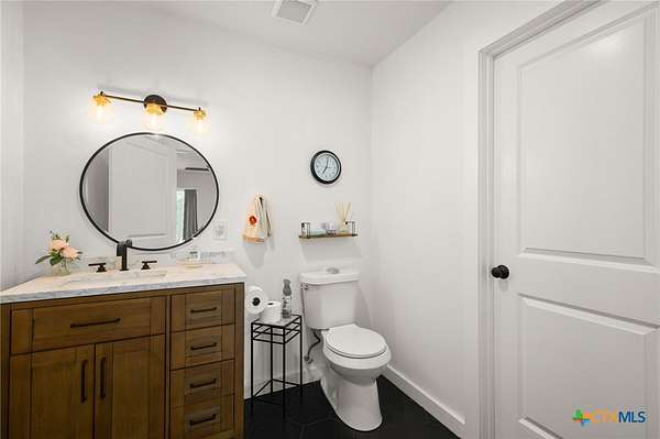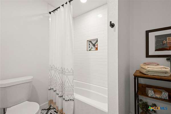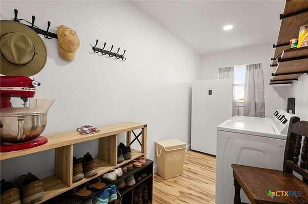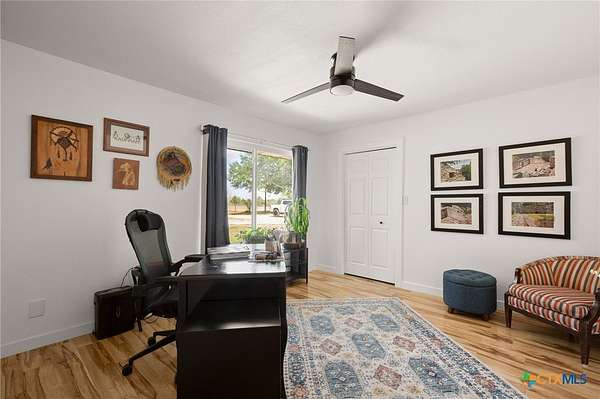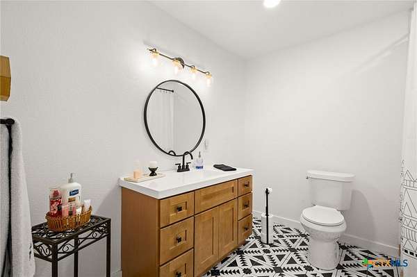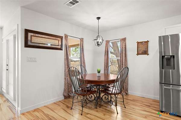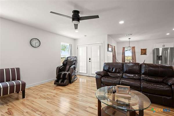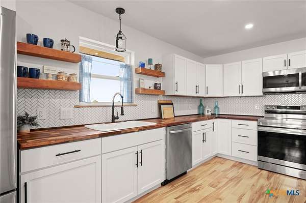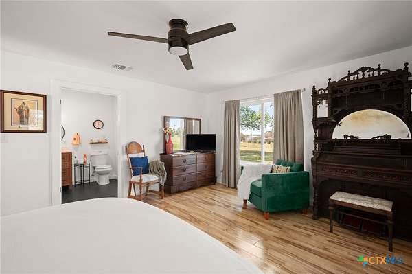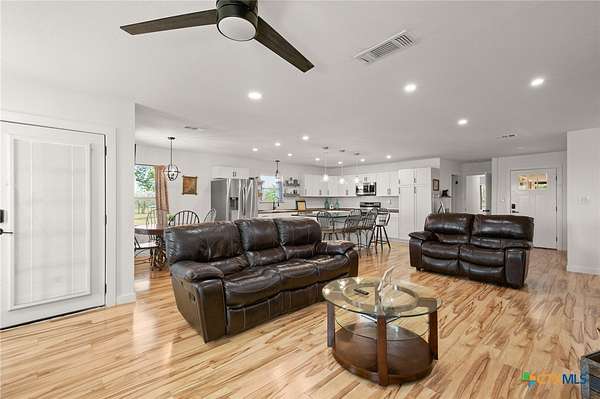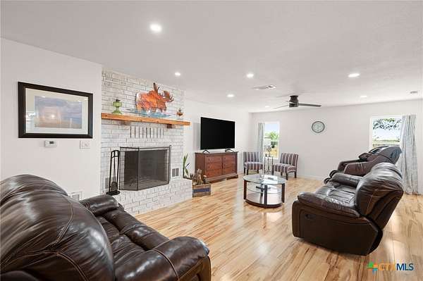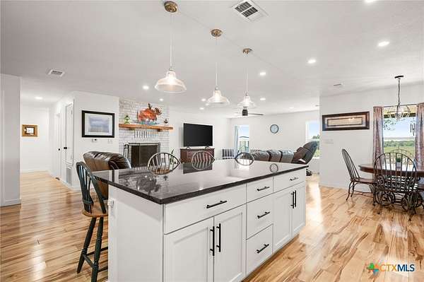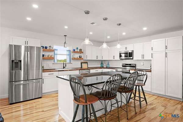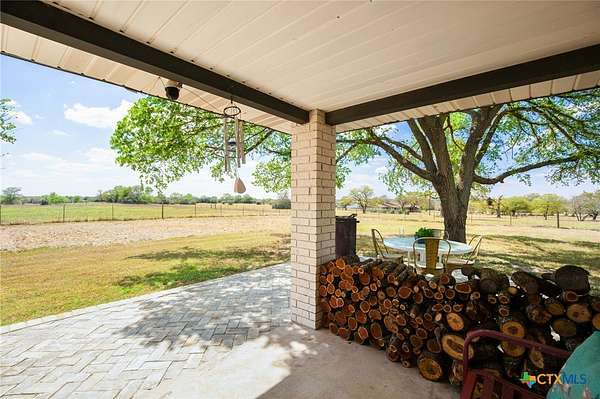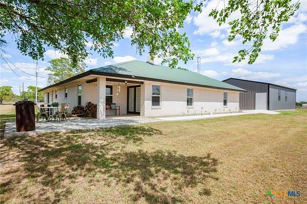 Discover modern country living on this pristine 5+ acre property in the sought-after Dale, TX area, offering no HOA and no deed restrictions. This move-in-ready single-story home features 5 bedrooms and 2.5 bathrooms with a bright, open-concept layout filled with natural light and easy-care laminate flooring throughout. The spacious living area includes a cozy wood-burning fireplace, while the chef's kitchen impresses with a large granite island, white cabinets, butcher block countertops, and stainless steel appliances. A flexible space off the living area works perfectly as a home office or formal dining room. Ideal for multi-generational living, the private in-law suite includes its own bedroom, en-suite bathroom, and walk-in closet. The primary suite offers an updated en-suite with a stylish vanity and tub/shower combo, while three additional bedrooms share a beautifully updated bathroom with black-and-white mosaic tile, plus a convenient half-bath for guests. Enjoy peaceful outdoor living with front and back porches, a garden-ready yard with irrigation points, exterior storage, and a chicken coop. The property is fully fenced and cross-fenced with goat and horse-friendly fencing, plus an automatic gated entrance and paved road frontage. A standout feature is the 30x40 detached workshop with three 12-foot roll-up doors, ideal for hobbies, storage, or a home business. Additional highlights include a tankless water heater and durable metal roof. This turnkey property offers space, flexibility, and true Texas country charm.